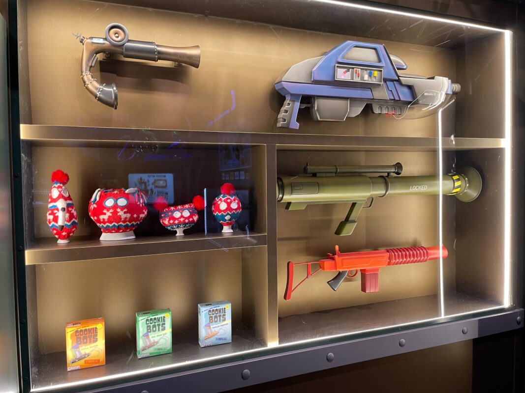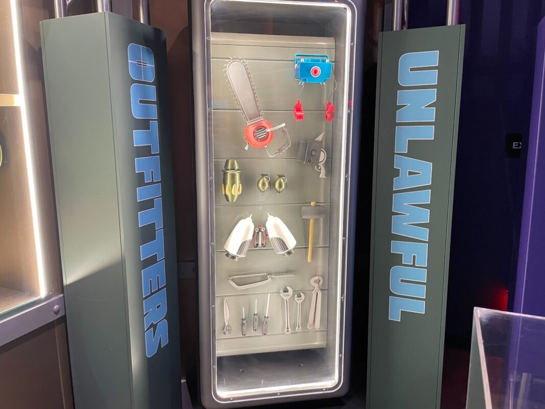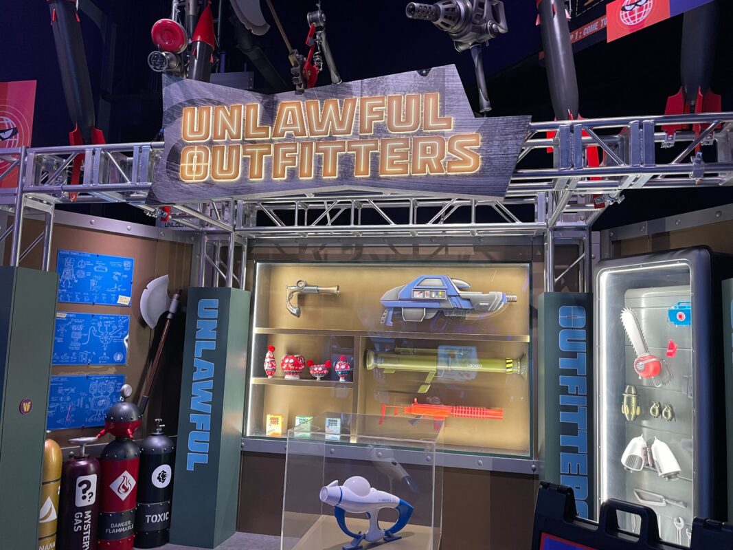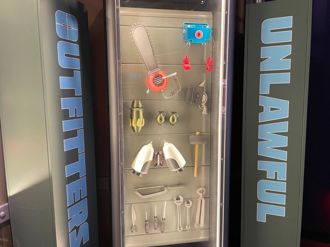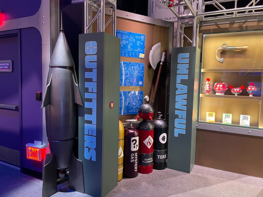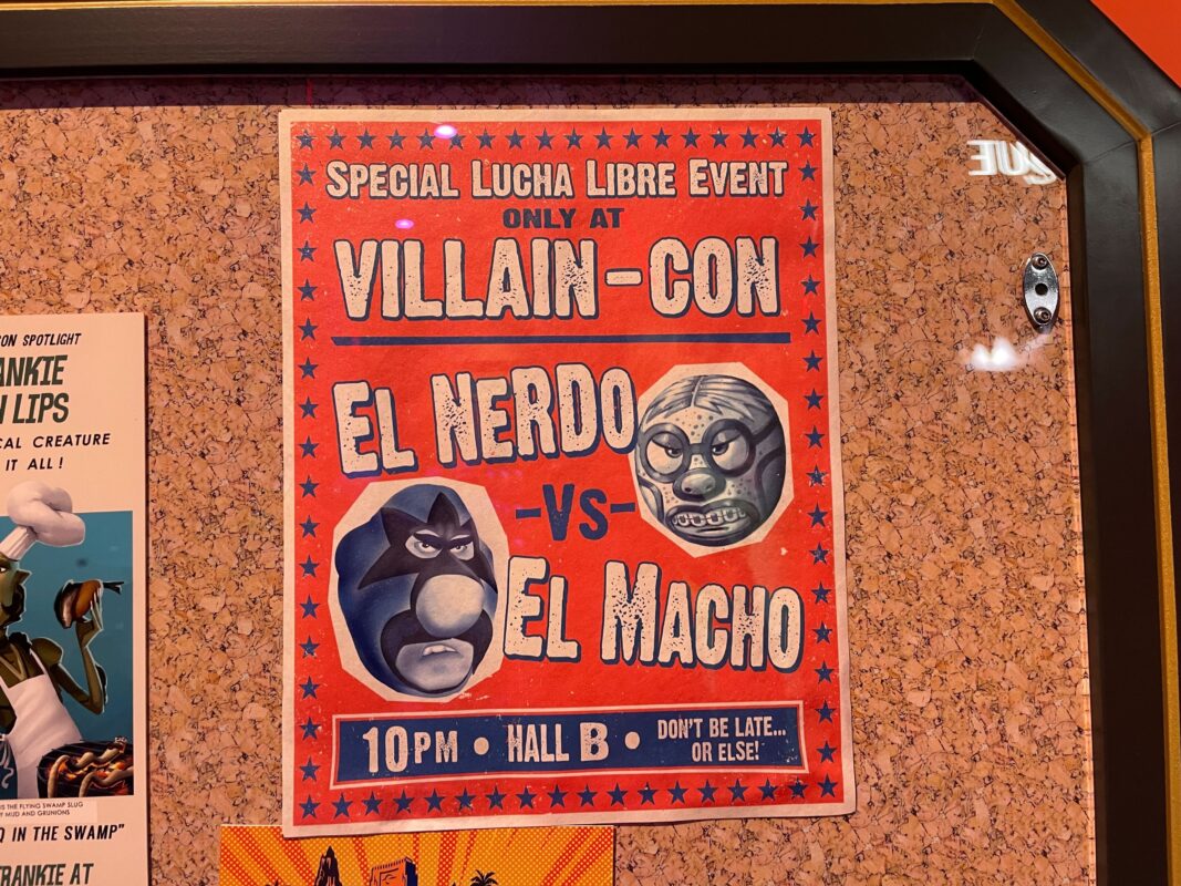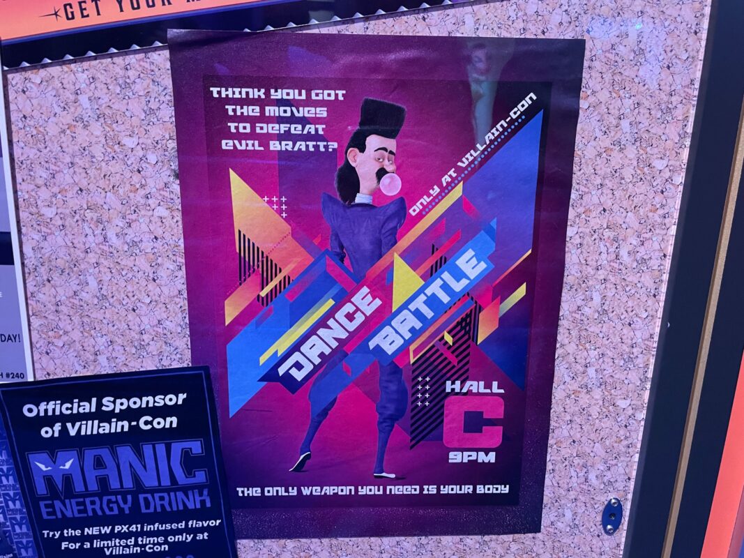 Inside is a large “Welcome to Villain-Con International” mural. There is also another warning sign here — the first was at the entrance — and a poster with info about the E-Liminator X that you’ll pick up soon. After this, guests enter the exhibition hall.