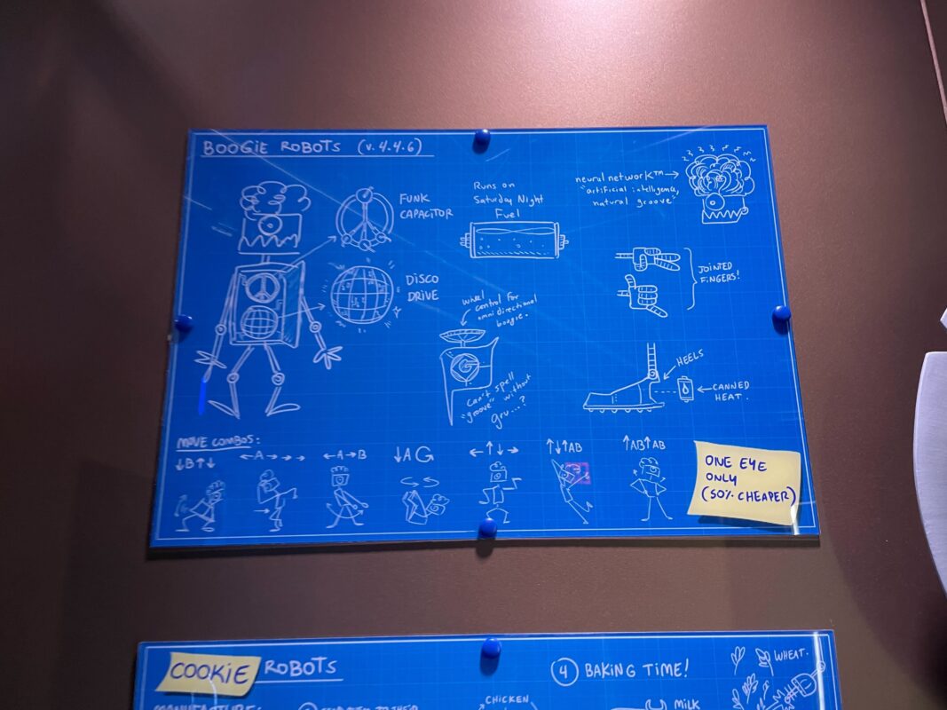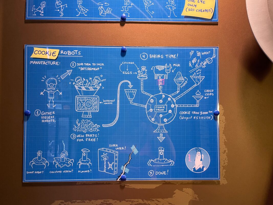 Blueprints show various robot inventions and a fart gun.