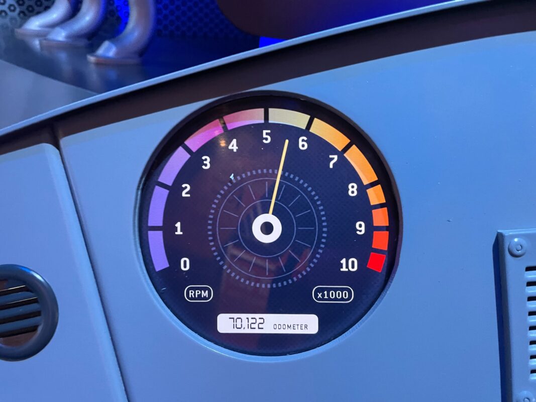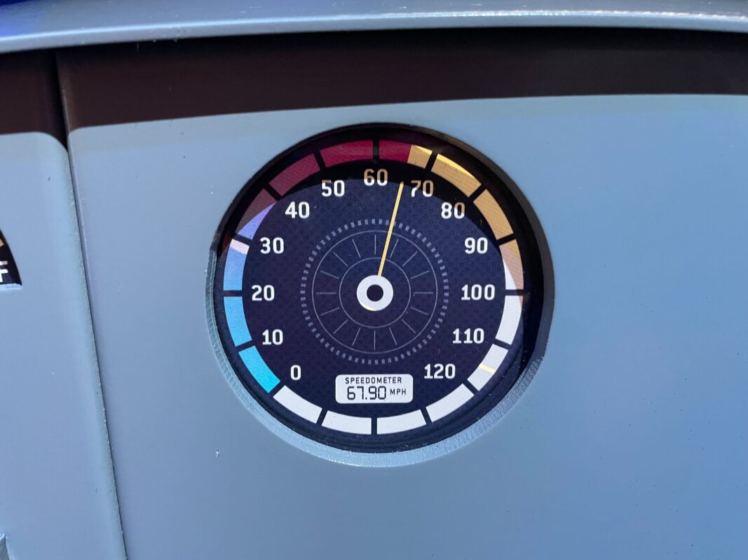 The speedometer reads 67.90, for June 7, 1990 — the opening date of Universal Studios Florida.