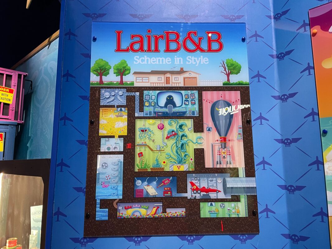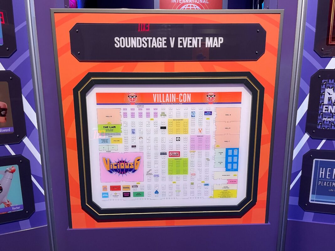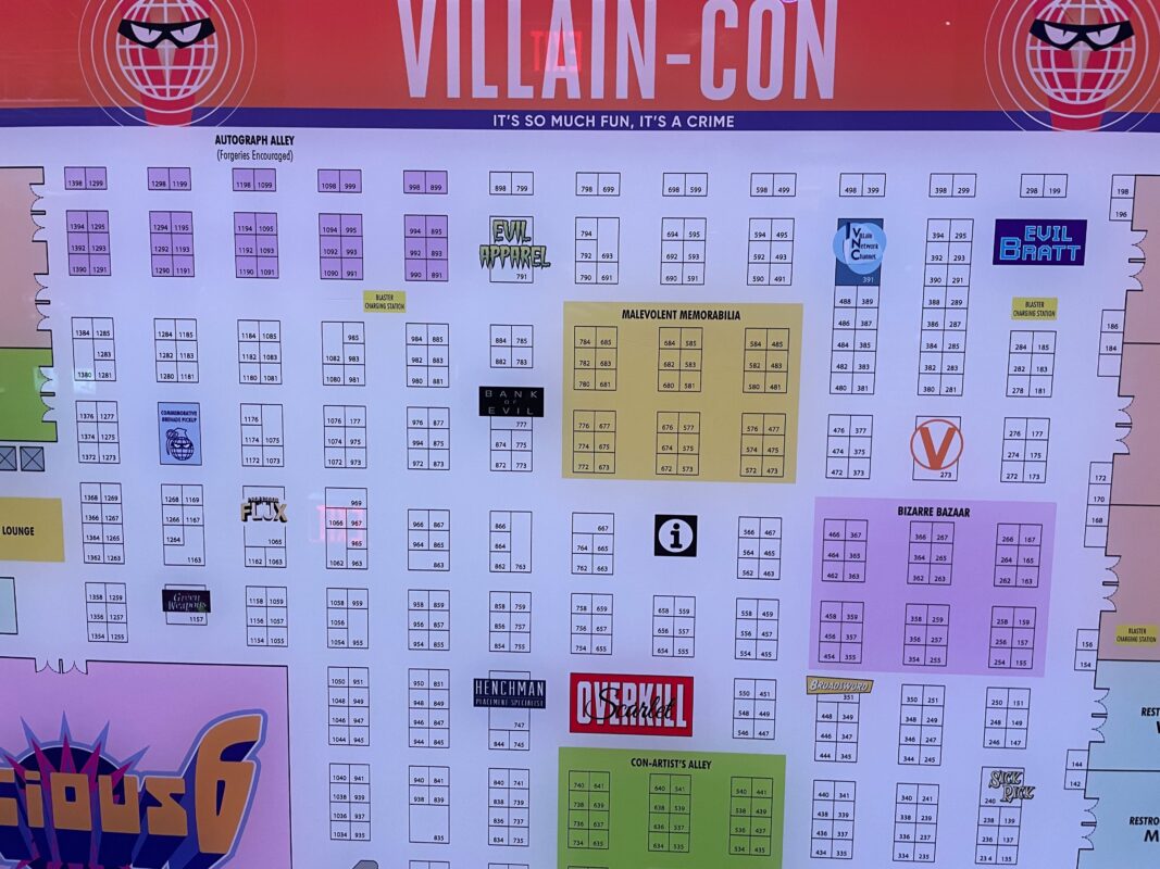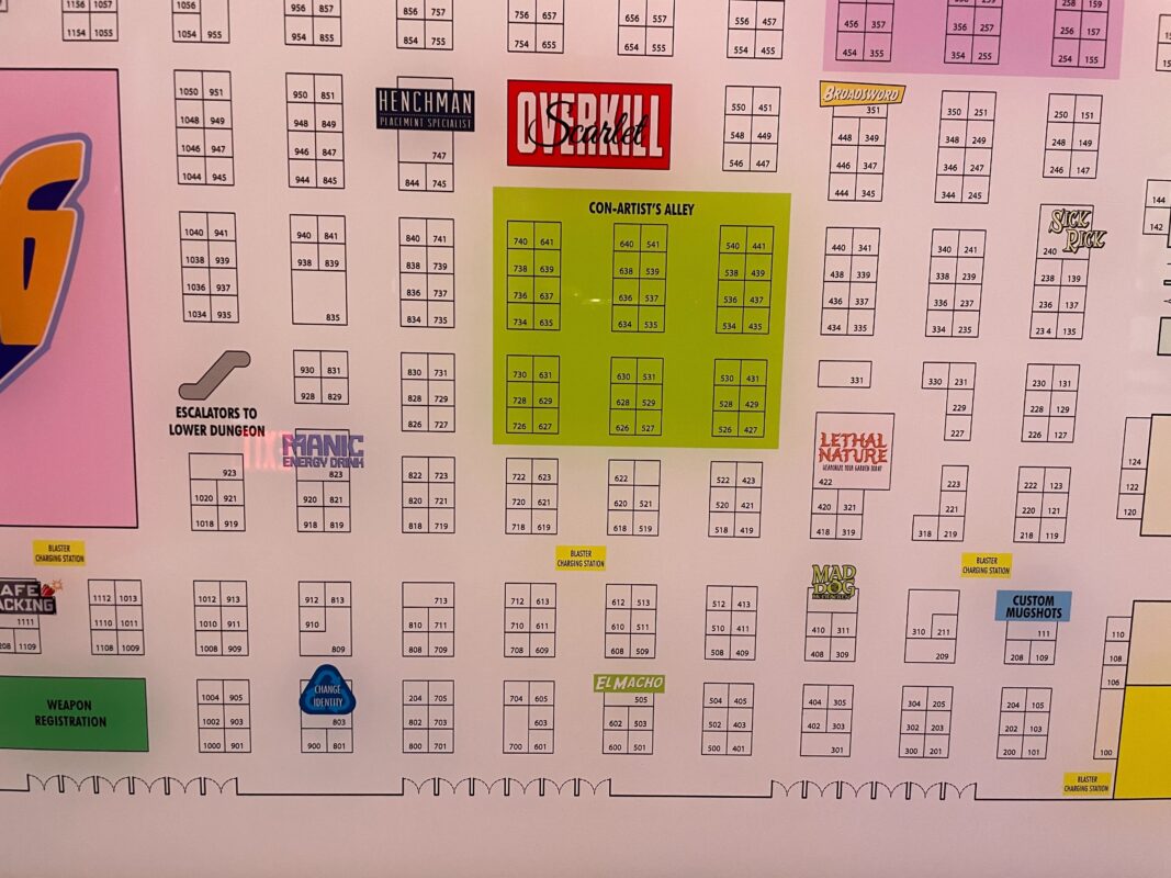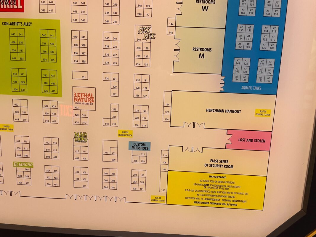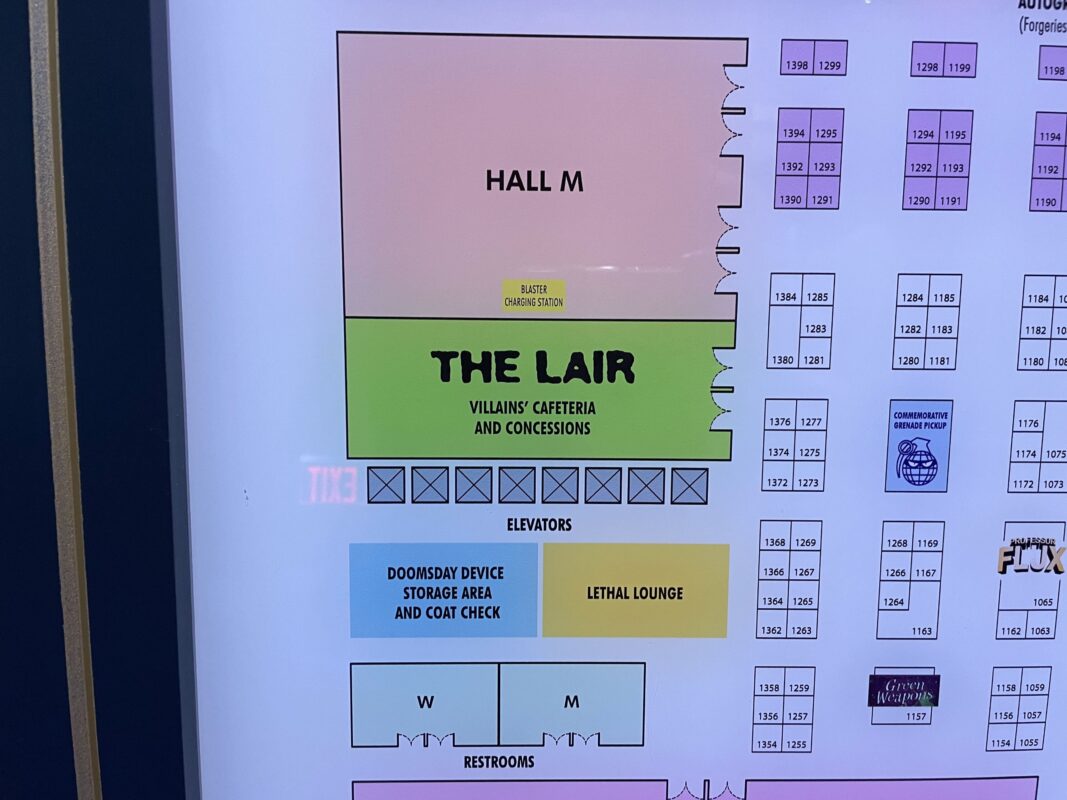 To the left is Hall M, which is labeled as the blaster charging station. Next to that is The Lair, the villains’ cafeteria and concessions. Then there are elevators, followed by “Doomsday Device Storage Area and Coat Check” and “Lethal Lounge.”
