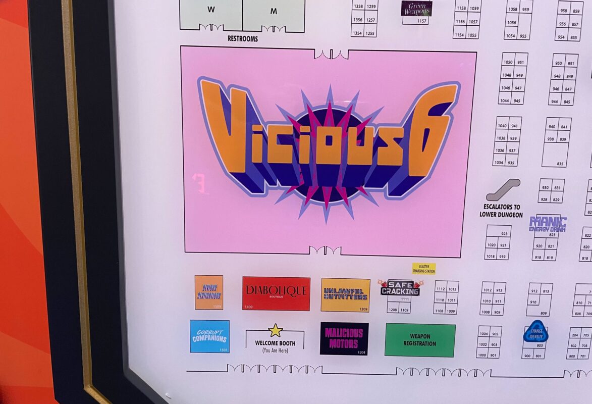 The largest box is just labeled Vicious 6. At the bottom are logos for the booths we’re about to visit.