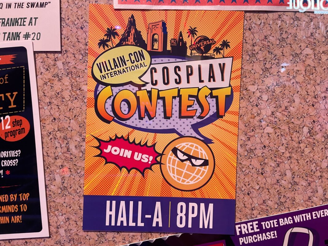 Villain-Con signs are on the trash cans.