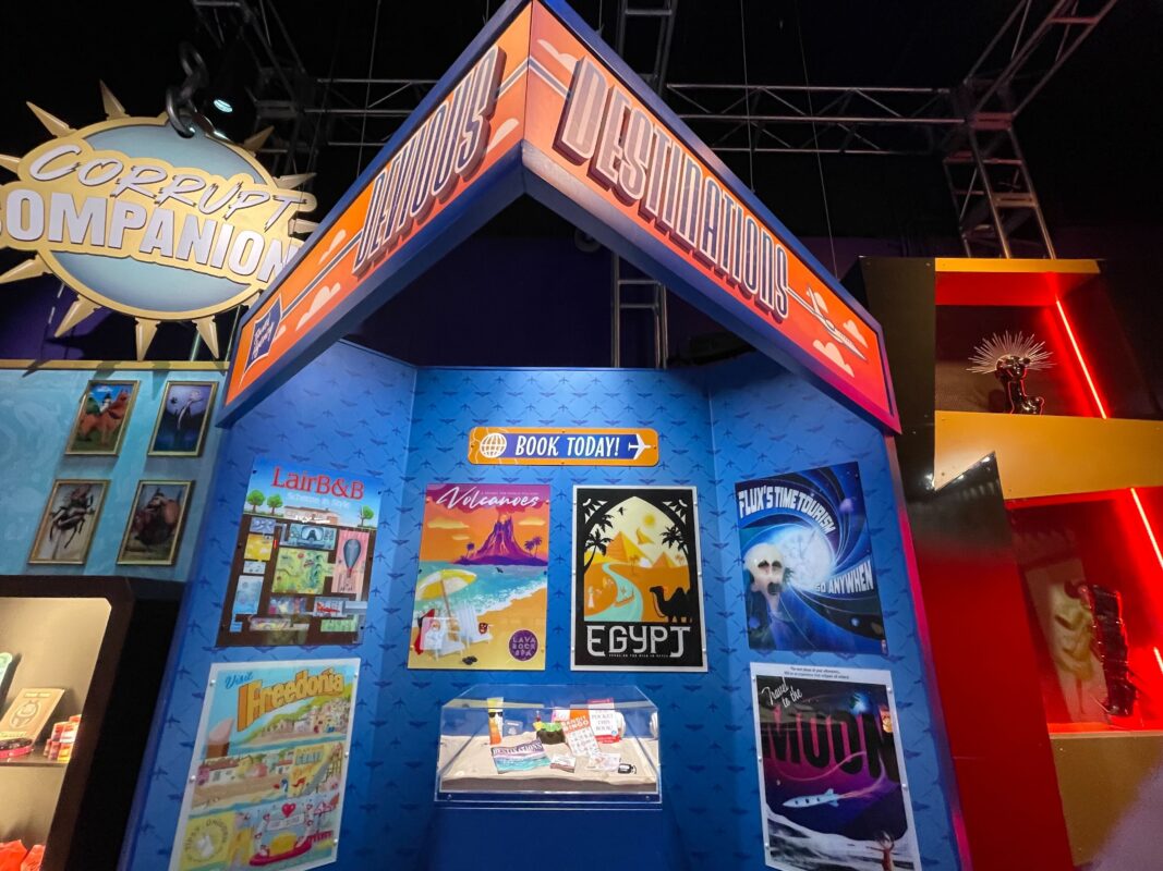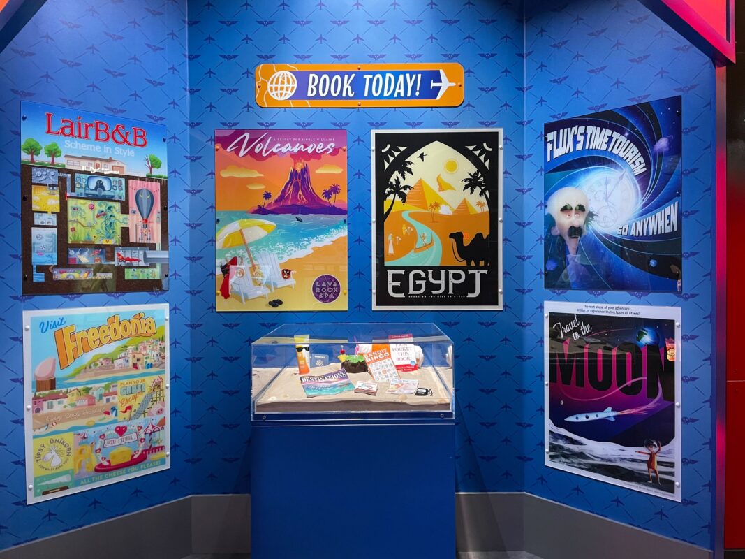 Posters advertise trips to volcanoes, Egypt, and the Moon.