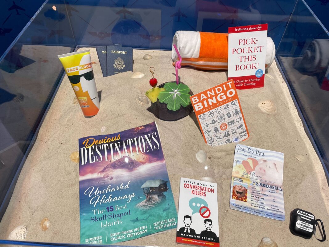 A display case has a sandy shelf covered in vacation essentials like passports and a coconut drink.