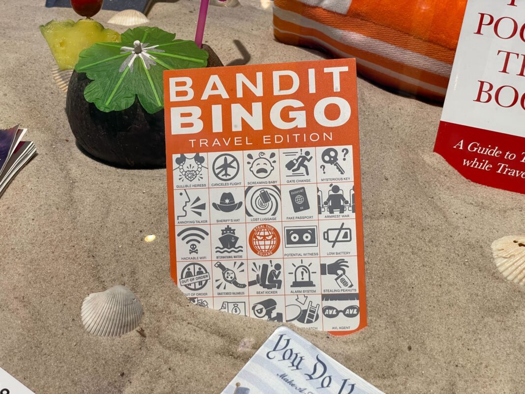 Bandit Bingo travel edition has players checking off a gullible heiress, screaming baby, mysterious key, armrest war, annoying talker, hackable wifi, and more.
