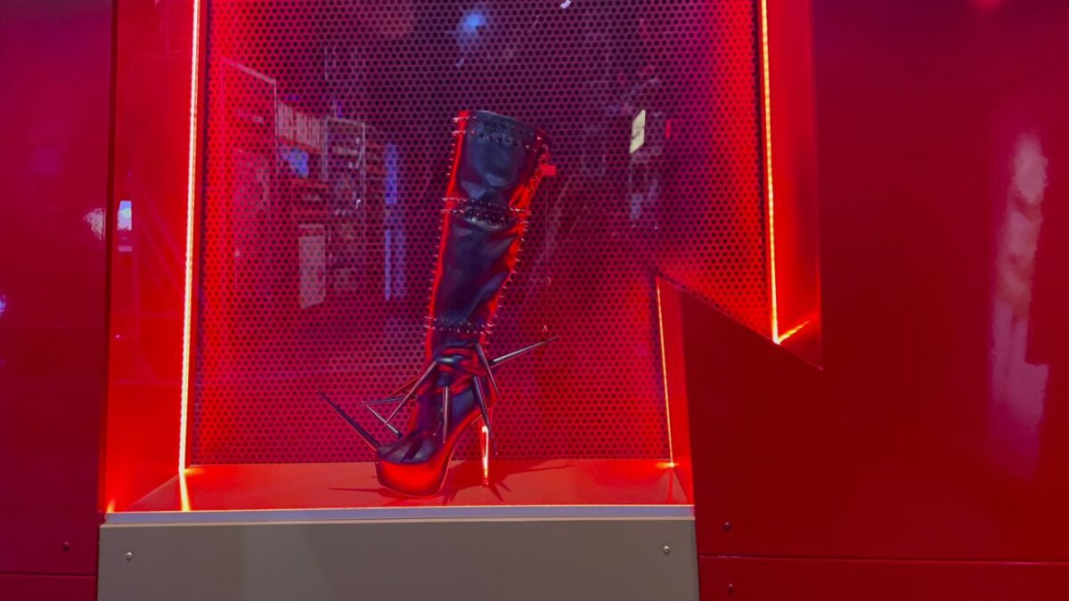 A spiked boot is in a display case.