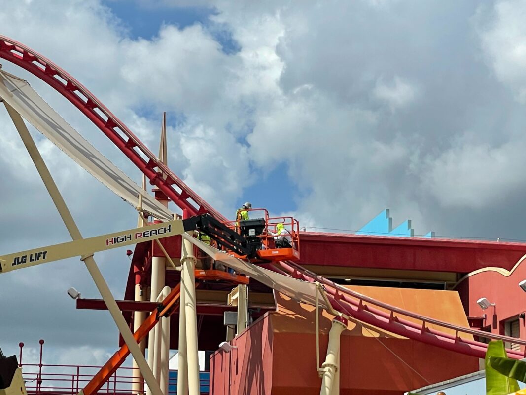 Construction crews could already be seen lifted up to work at one of the roller coaster’s drops.