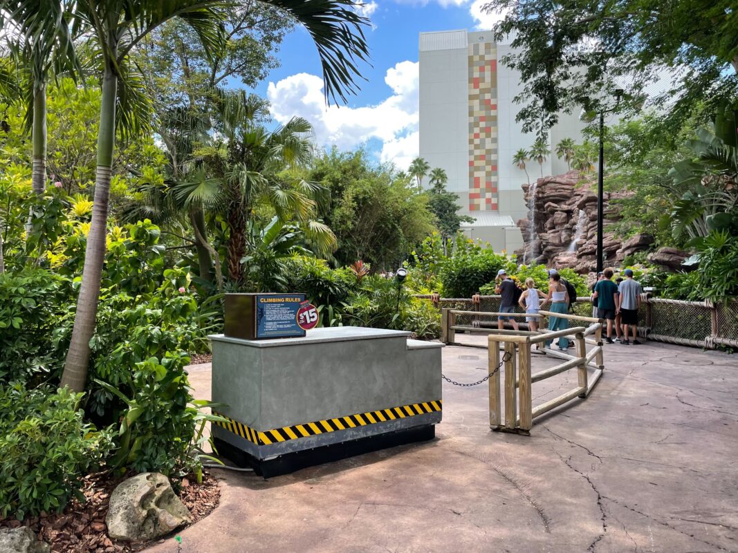 The rock climbing wall located in Jurassic Park was set up just across from the entrance to Camp Jurassic, near the splashdown area of Jurassic Park River Adventure. The wall itself has been completely removed from the fenced-in area, but the desk and signage still remain at this time.