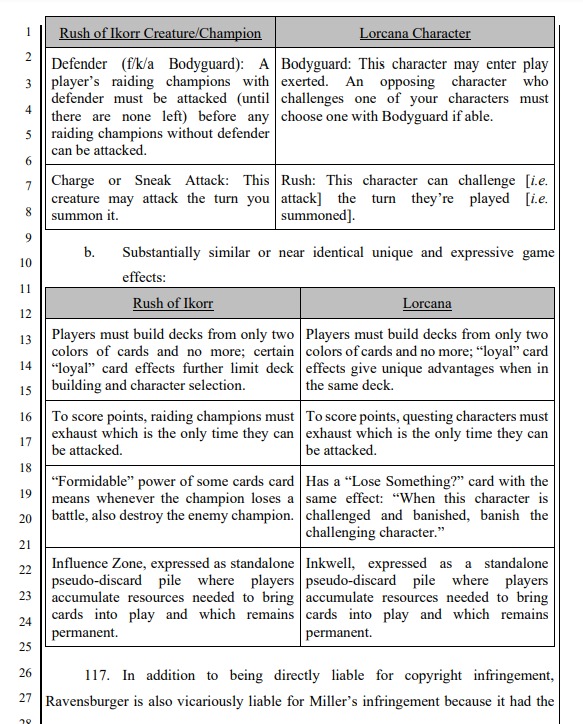 Upper Deck is a private company primarily known for producing trading cards. The company is filing a suit against Ravensburger and Ryan Miller, former Upper Deck contractor and current Ravensburger Lorcana designer, “for stealing and copying Upper Deck’s original game which Ravensburger repackaged and marketed as ‘Lorcana.’”