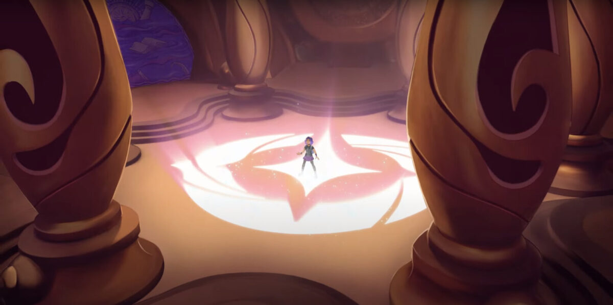 In a flash of bright light, the woman opens her eyes and finds herself inside a grand and wide-open hall. The symbol glows brightly on the ground.