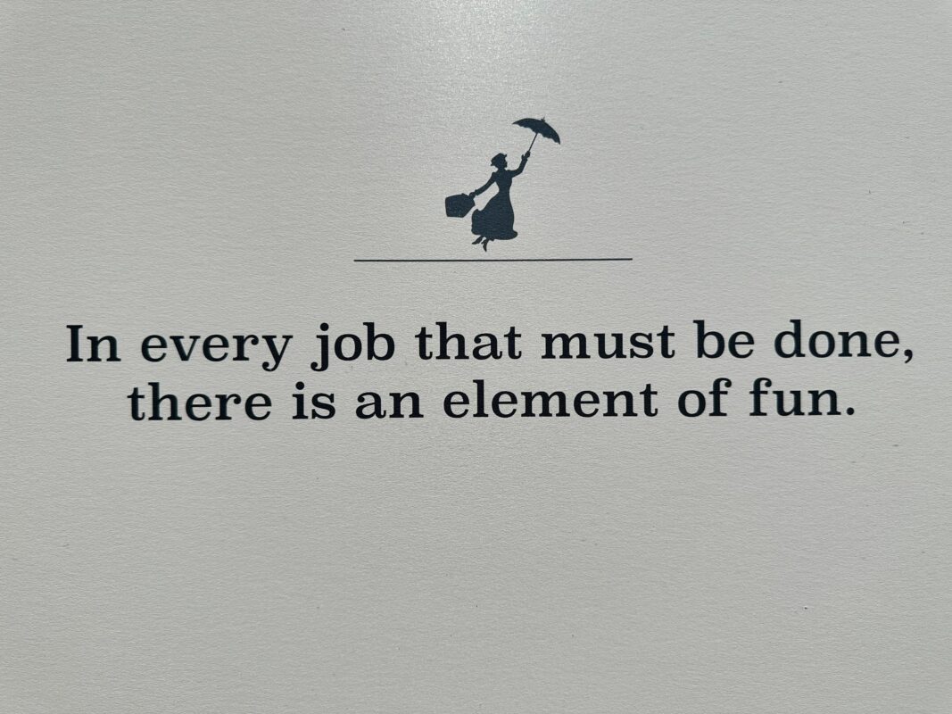 In the middle there is a silhouette of a Disney character, in this case, it is Mary Poppins. A uniquely themed phrase is also seen, “In every job that must be done, there is an element of fun.”