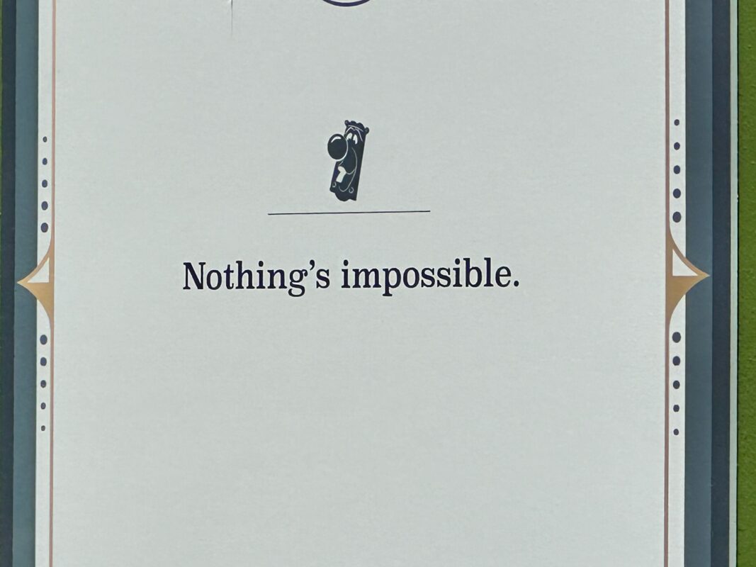 This sign features Jane Banks from “Mary Poppins” hanging on to a kite and reads “Everything is possible. Even the impossible.”