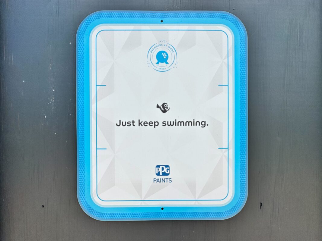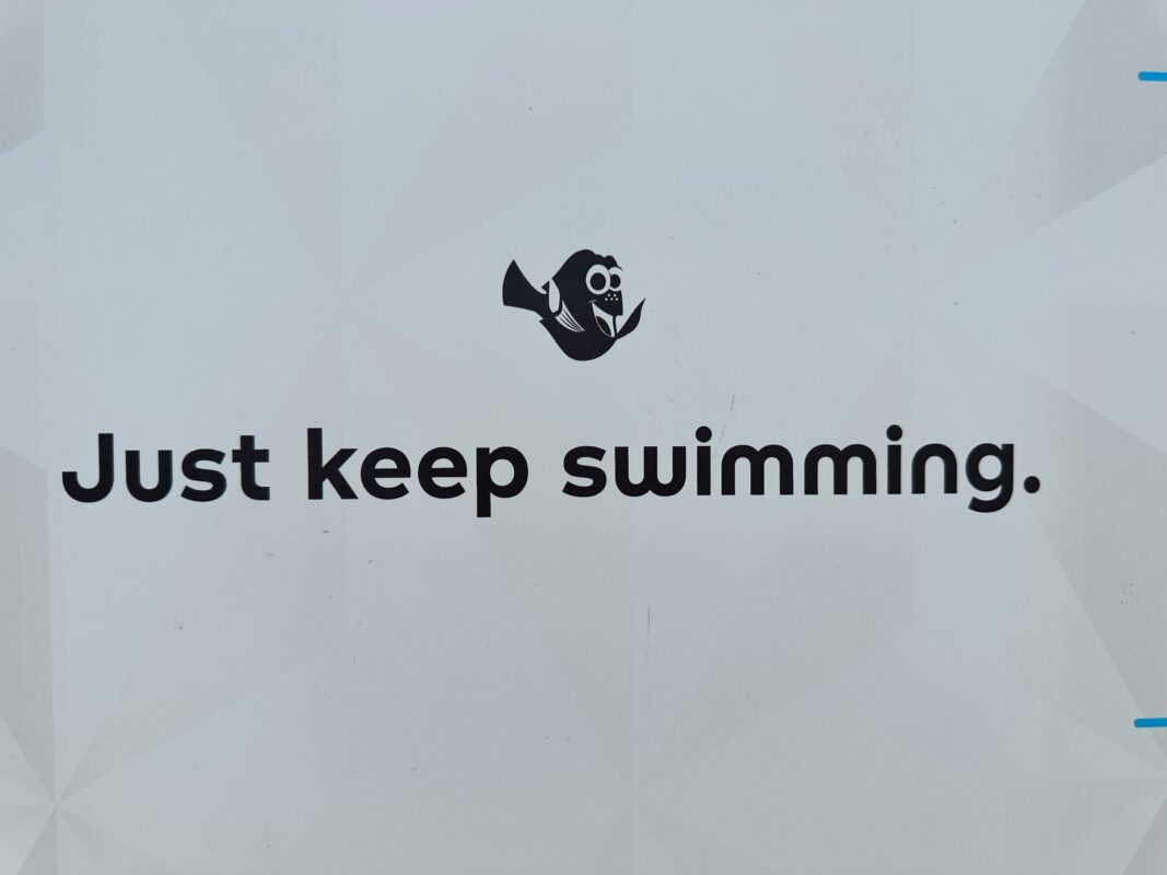 On this sign, Dory reminds us to “Just keep swimming.”