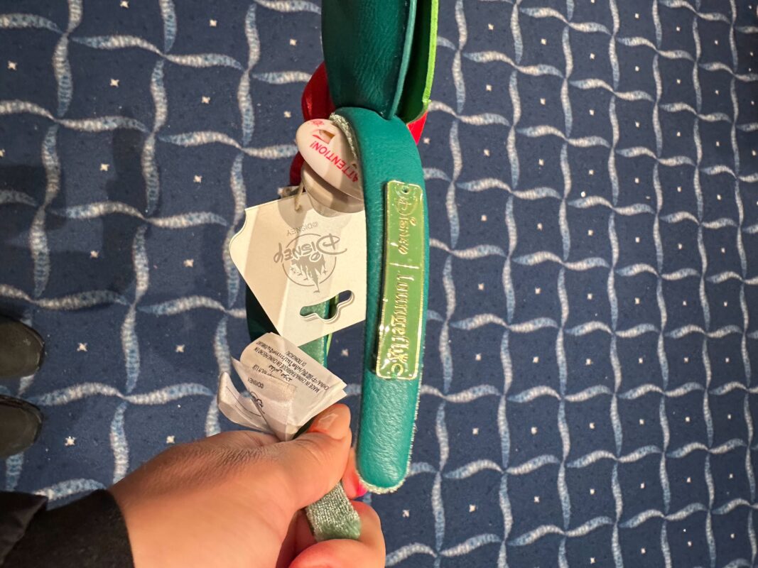 A green Disney and Loungefly plaque is sewn onto the right side of the headband.