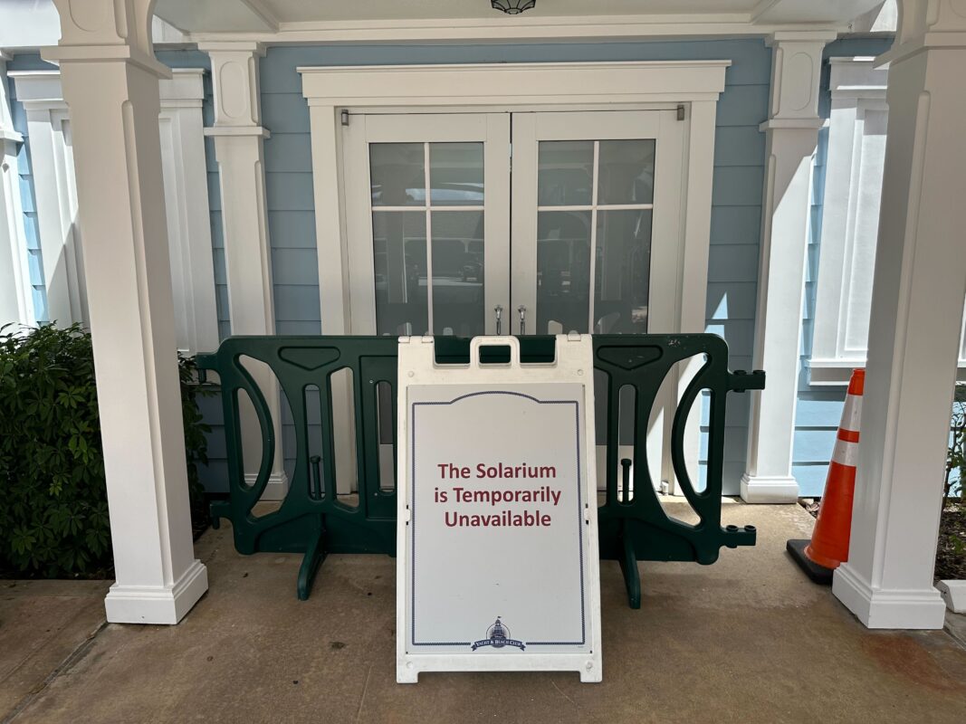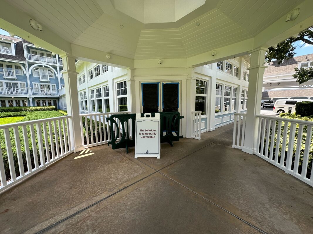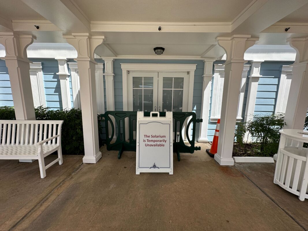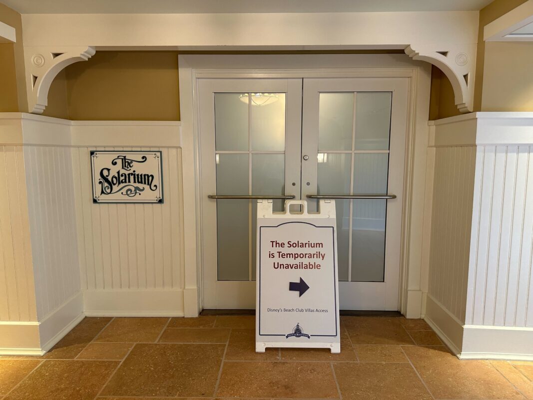The Solarium is a relaxation space with windows, a TV, couches, and chairs. During outdoor construction, the walkway from the lobby to the villas was re-routed through The Solarium, but this work is now complete.