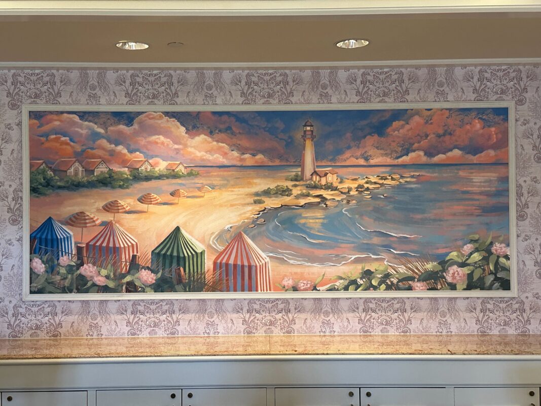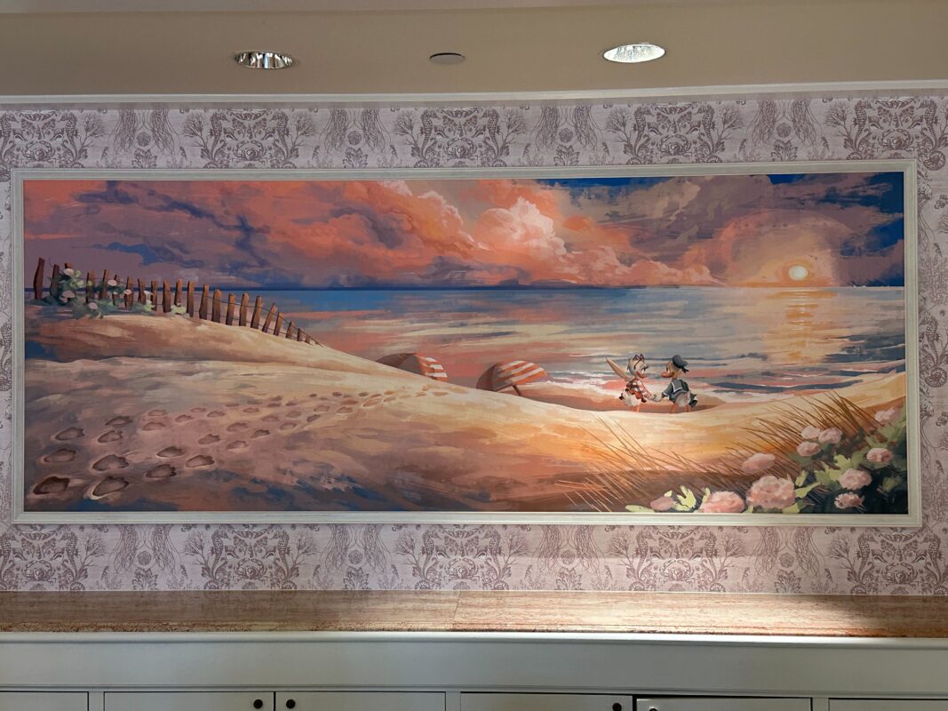 The wallpaper behind the counter is a light pink with a damask pattern of seashells and other beach-like elements. New artwork depicts a beach at sunset.