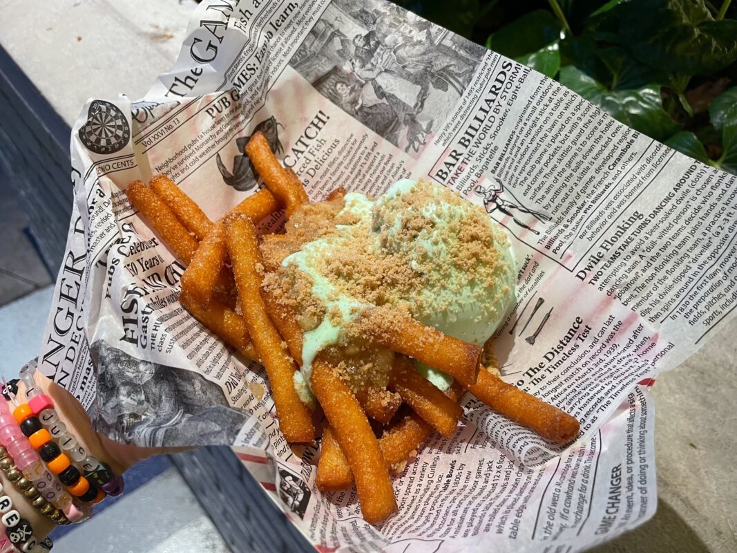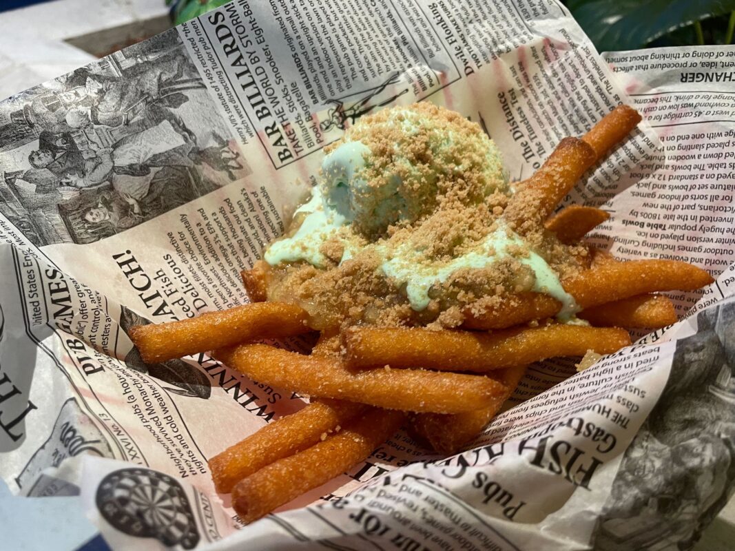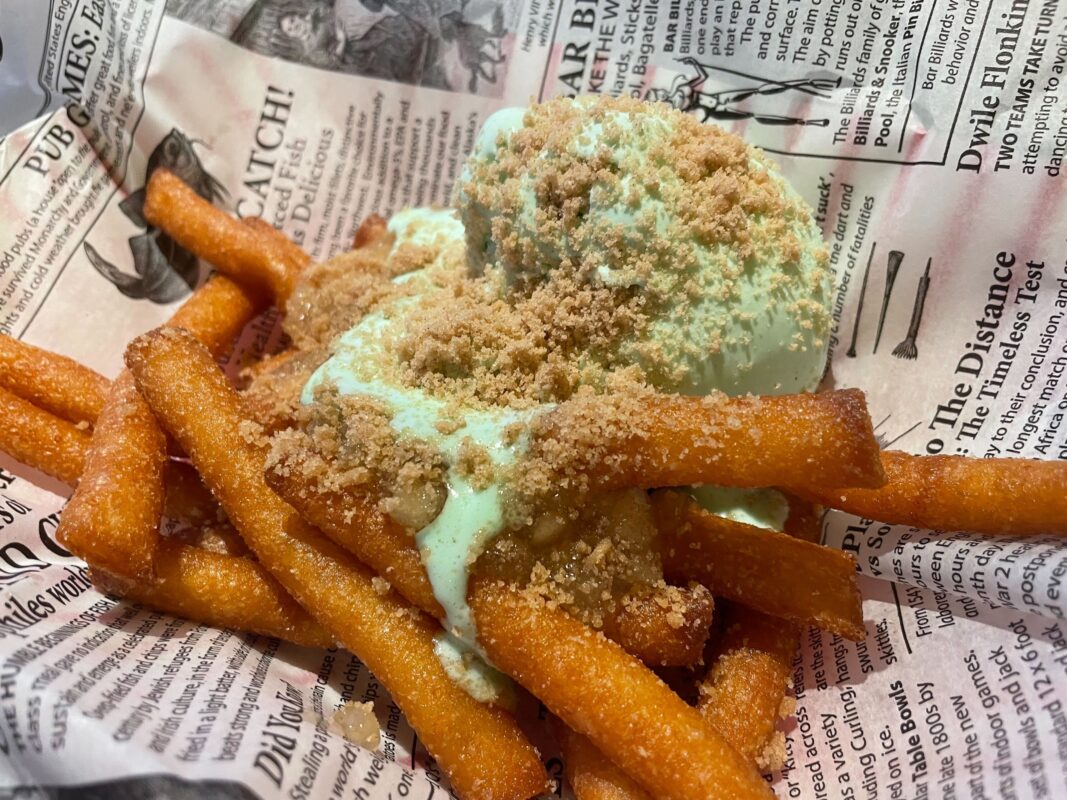 Sour sugar seasoned funnel fries topped with apple pie filling, sour apple ice cream, and streusel