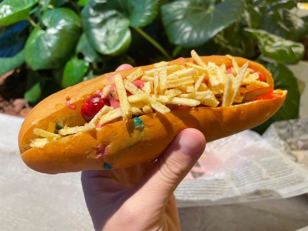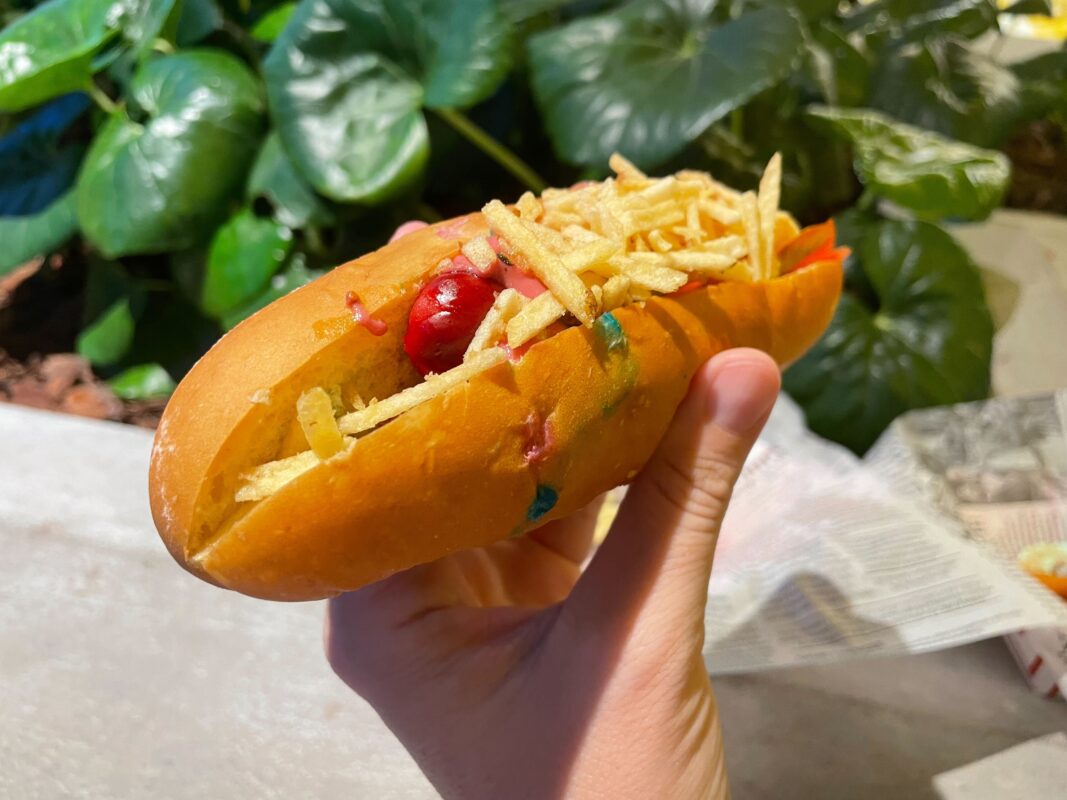 Red hot dog in a Funfetti hot dog bun, Kool-Aid pickles, bubblegum mustard, and potato sticks