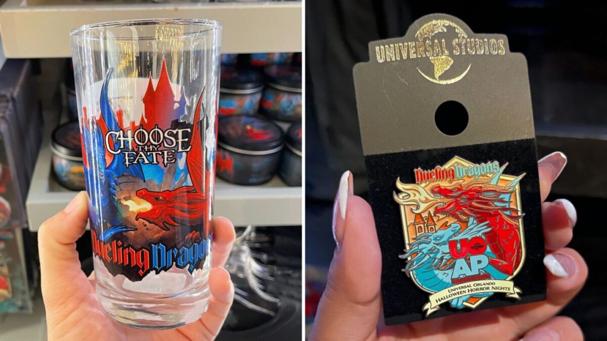 New merchandise representing a beloved former attraction has swooped into Universal Orlando Resort, as a previously debuted Universal Orlando Annual Passholders-exclusive Dueling Dragons merchandise set has expanded to include a ride-themed glass and pin. Interest in and representation of the defunct roller coaster has been renewed thanks to the Dueling Dragons: Choose Thy Fate haunted house offered as part of Halloween Horror Nights 32, which is running on select nights at Universal Studios Florida through November 4.