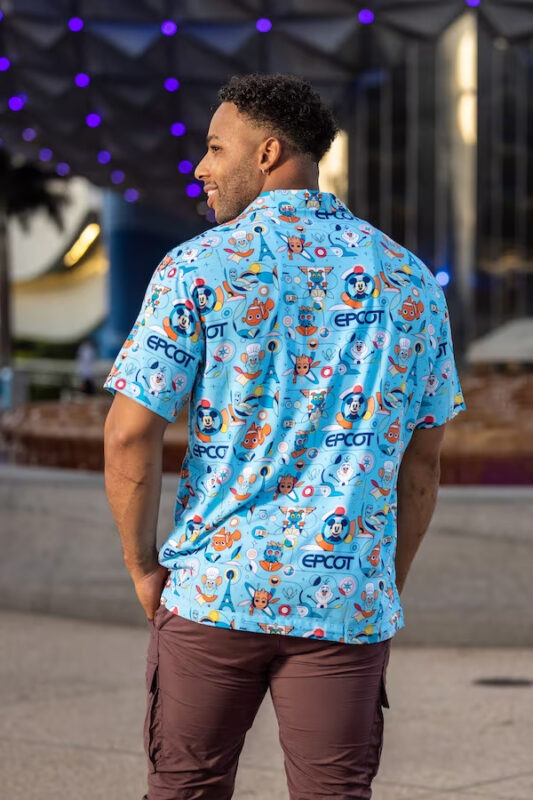 The EPCOT Reimagined Spirit Jersey features the same characters and design elements paying homage to EPCOT attractions and experiences. These include the SIM Car from Test Track, space shuttle from Mission: SPACE, World Showcase pavilions, the entrance fountain, and the Monorail.