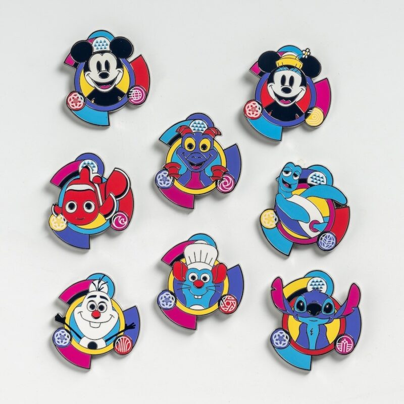Lastly, the EPCOT Reimagined Mystery Pin Set already released features EPCOT characters, plus Stitch, with pavilion logos.