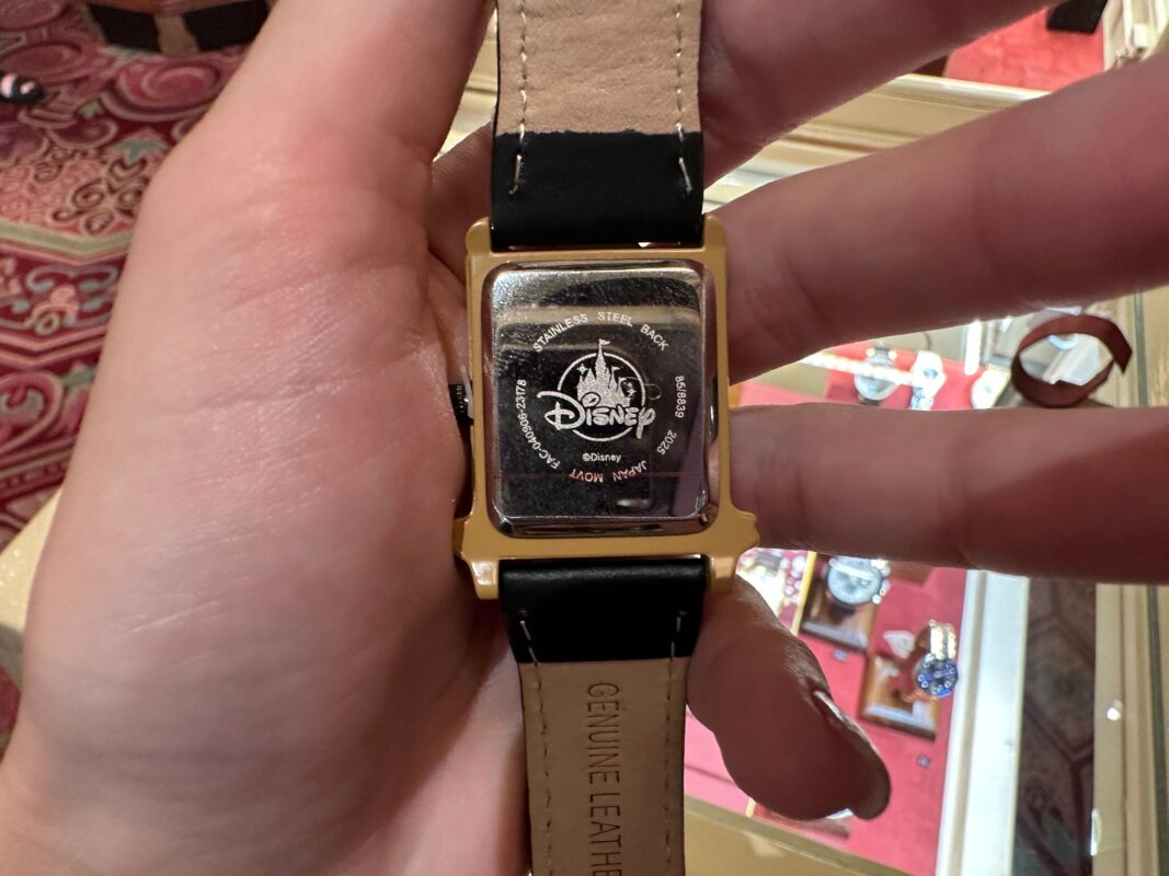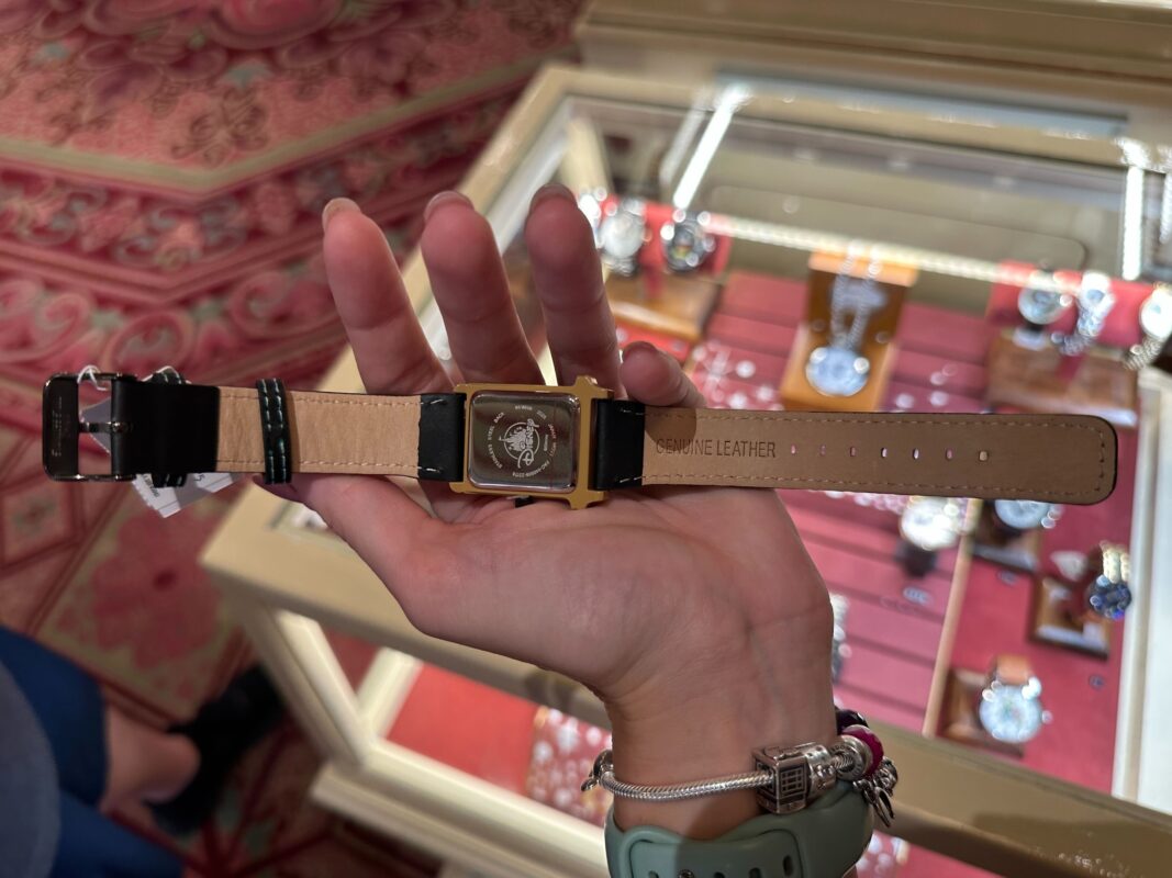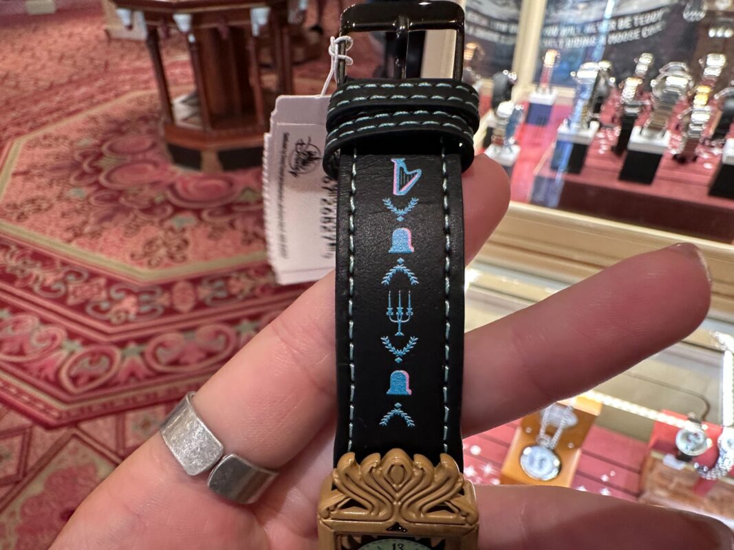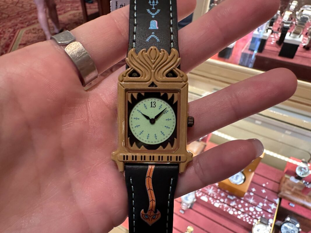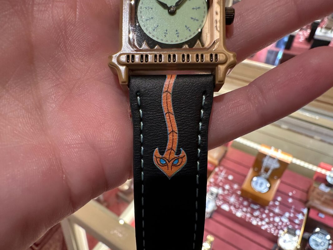 The watch piece features 12-hour indicators in addition to the “13” printed at its top. It’s the same bright shade of green as the clockface in the attraction and is surrounded by the same demonic creature-like detailing. The clock’s demon tail-like pendulum is printed on the black leather strap beneath the centerpiece.