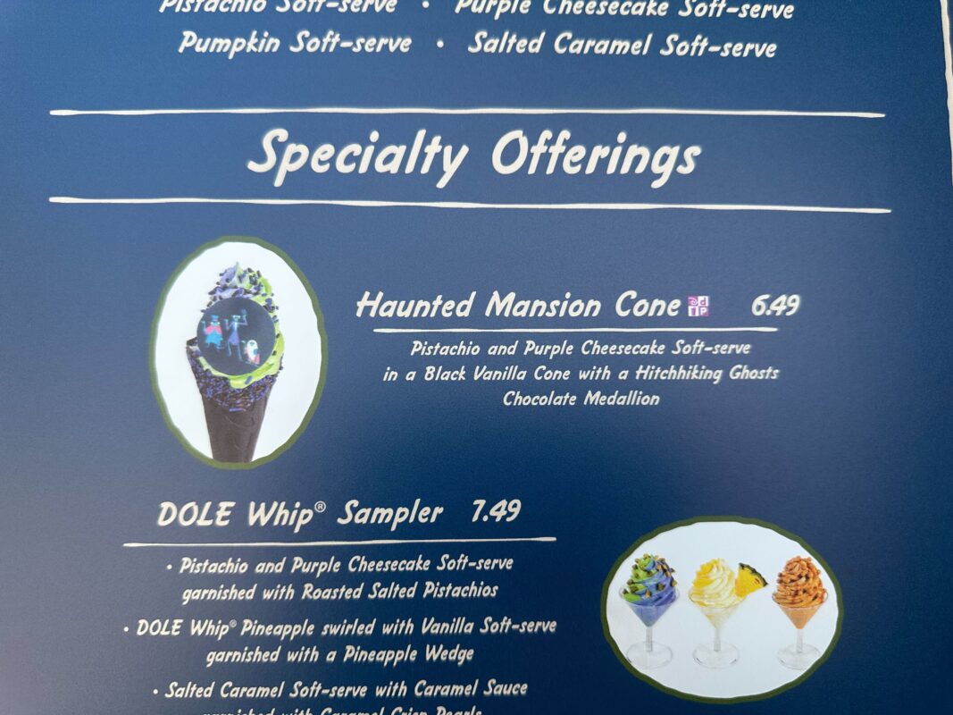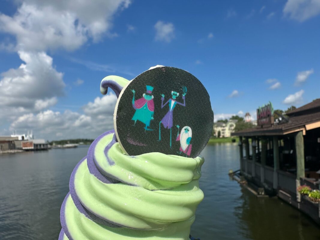 The Haunted Mansion Cone was introduced as part of the Halloween menu at Swirls on the Water alongside the DOLE Whip Sampler and an Apple Cider Slush with Pumpkin Soft Serve.
