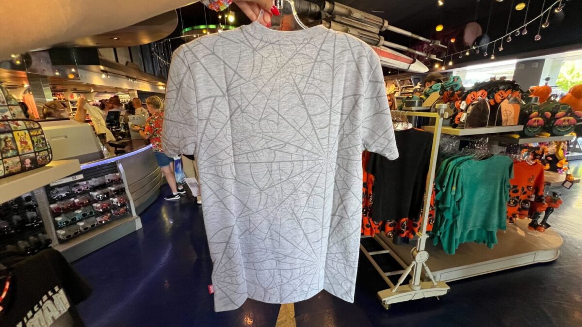 The shirt is grey with an allover spiderweb print. The front of the shirt has comic book style art featuring Mickey Mouse swinging over the suburbs of a city as Spiderman.