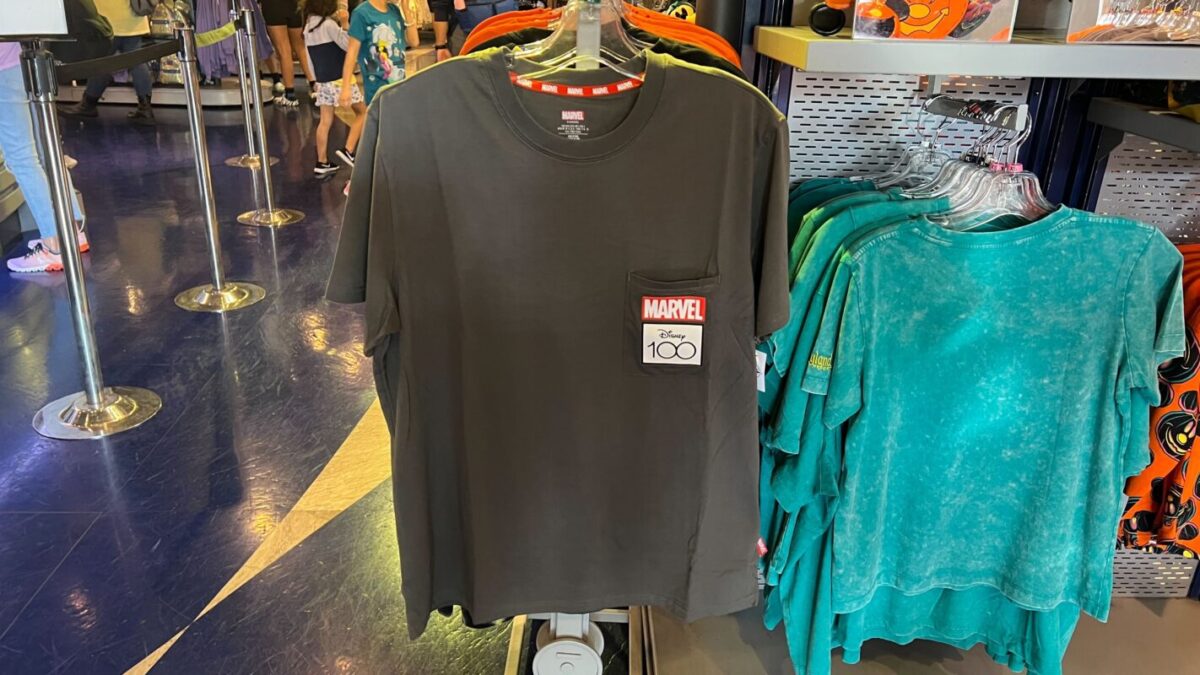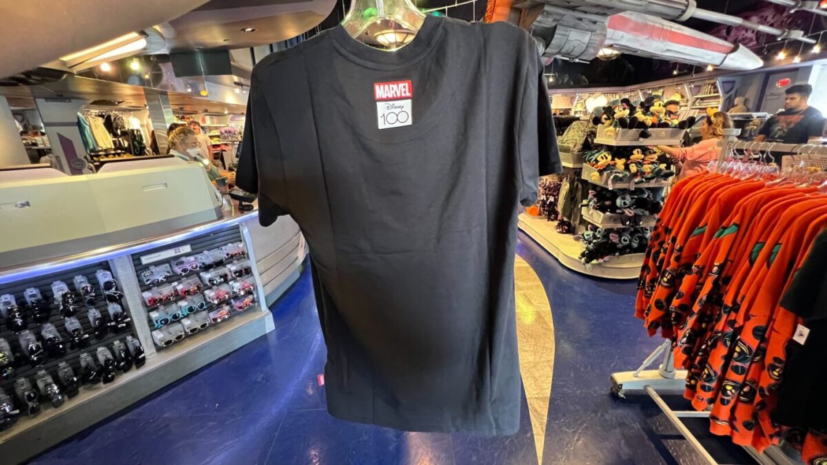The front of this black shirt has the Marvel x Disney100 logo on the breast pocket.