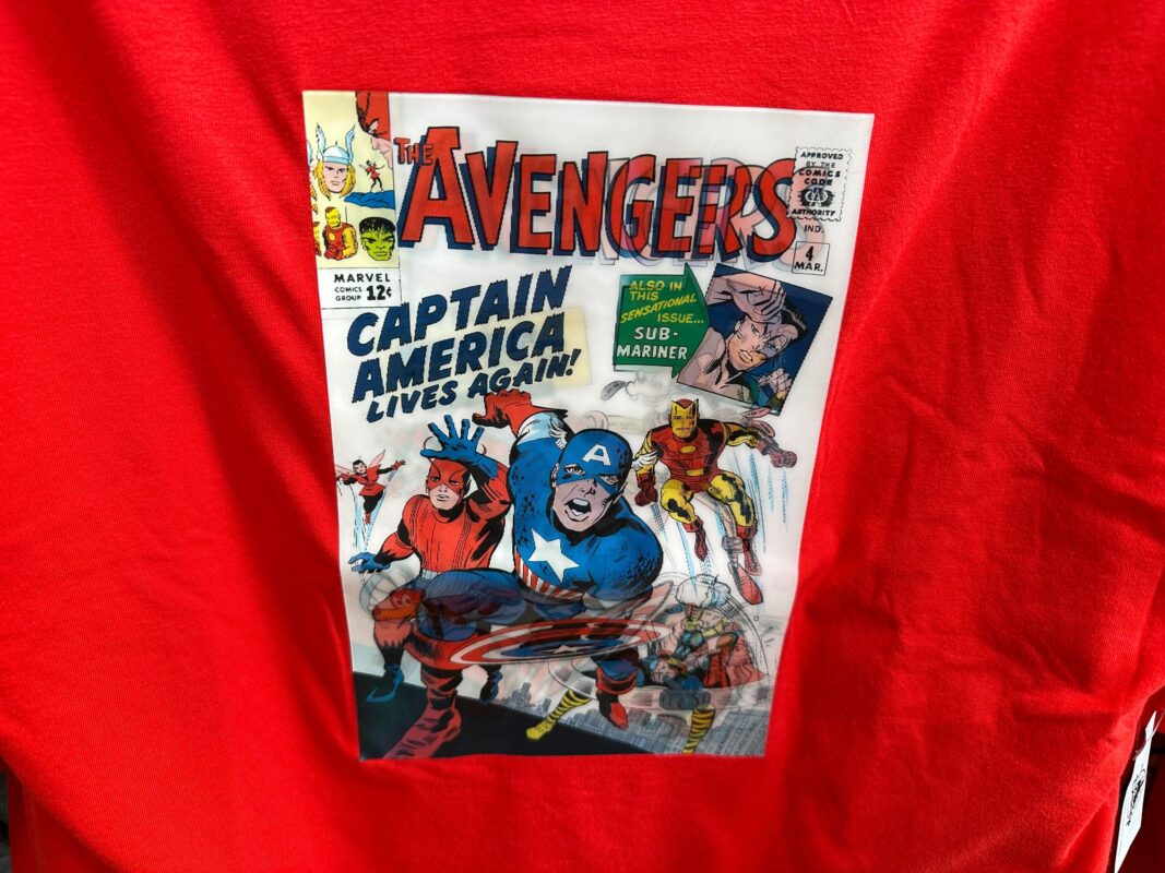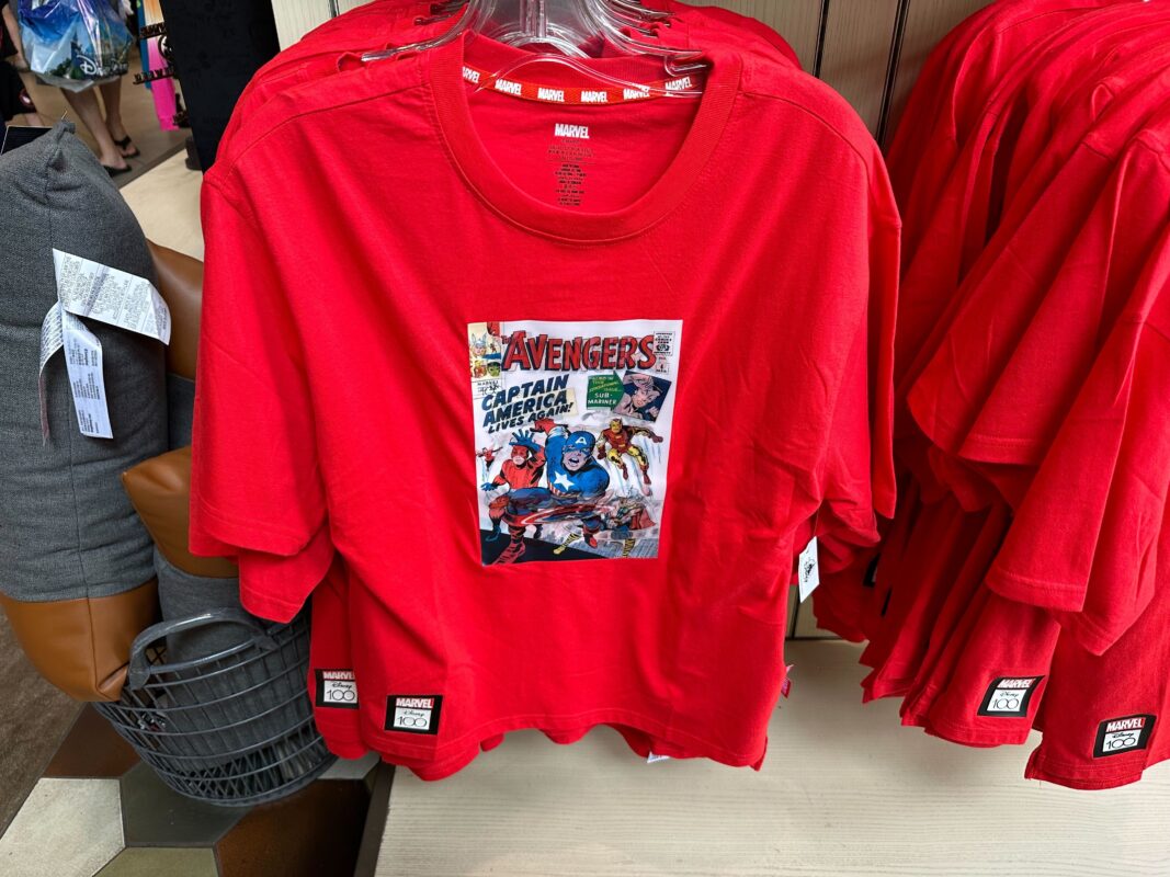 The back of the shirt has all twelve of the Marvel x Disney100 comic book crossover covers.