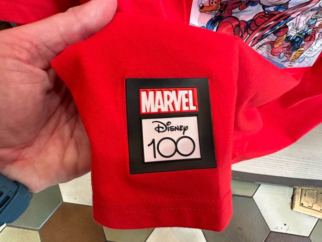 The back collar of the shirt is printed with the Marvel x Disney100 logo.