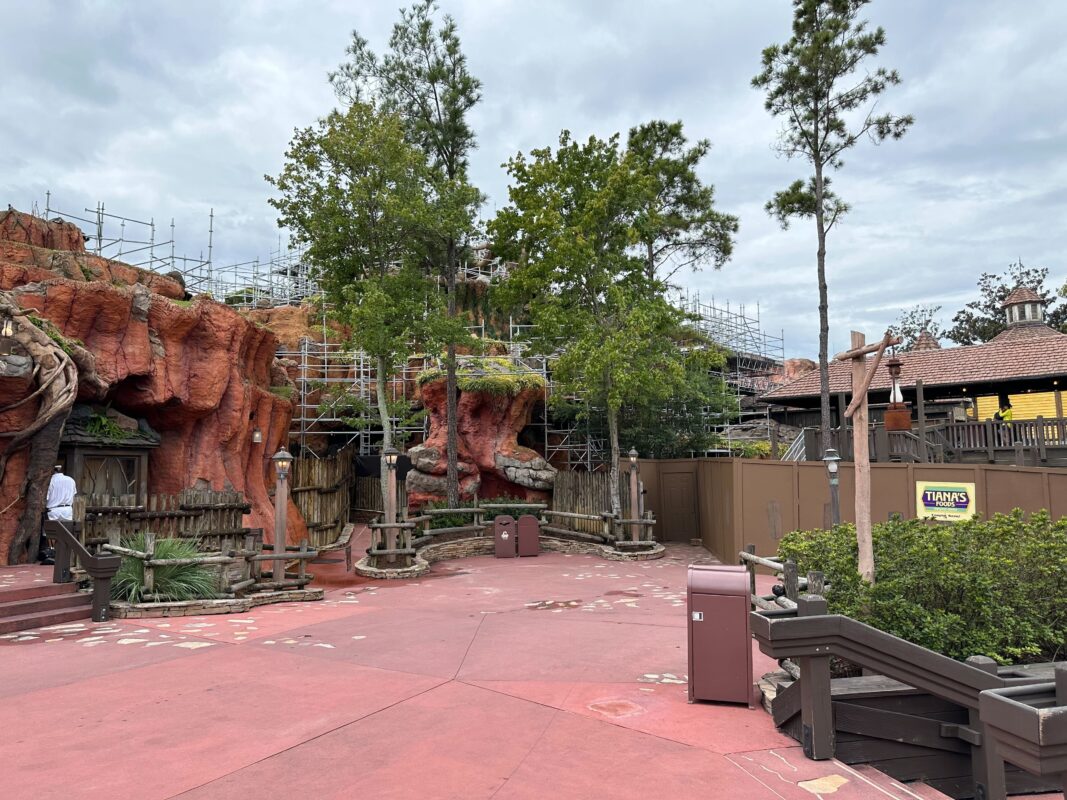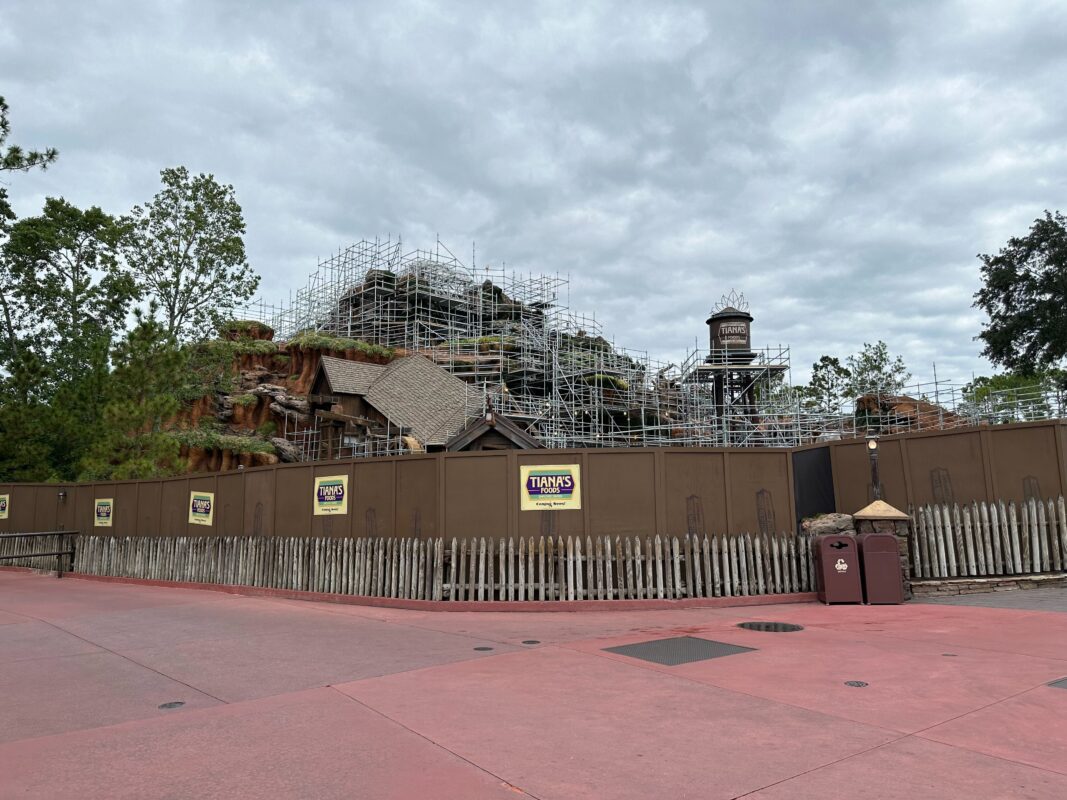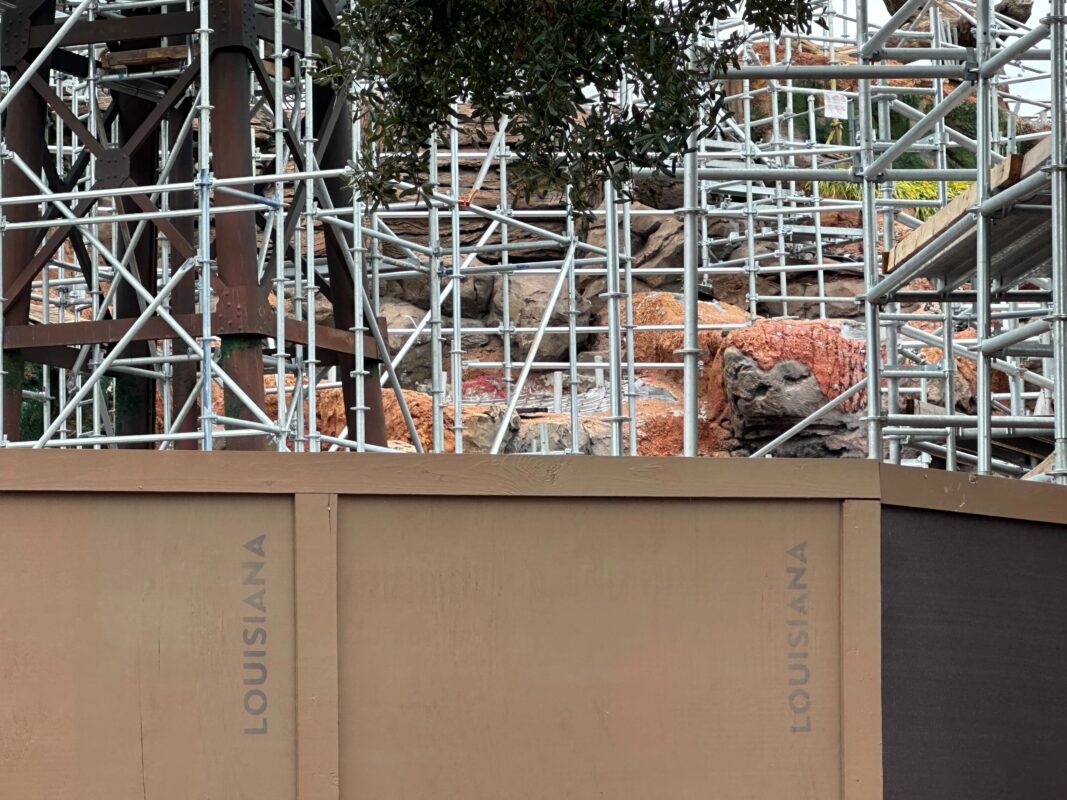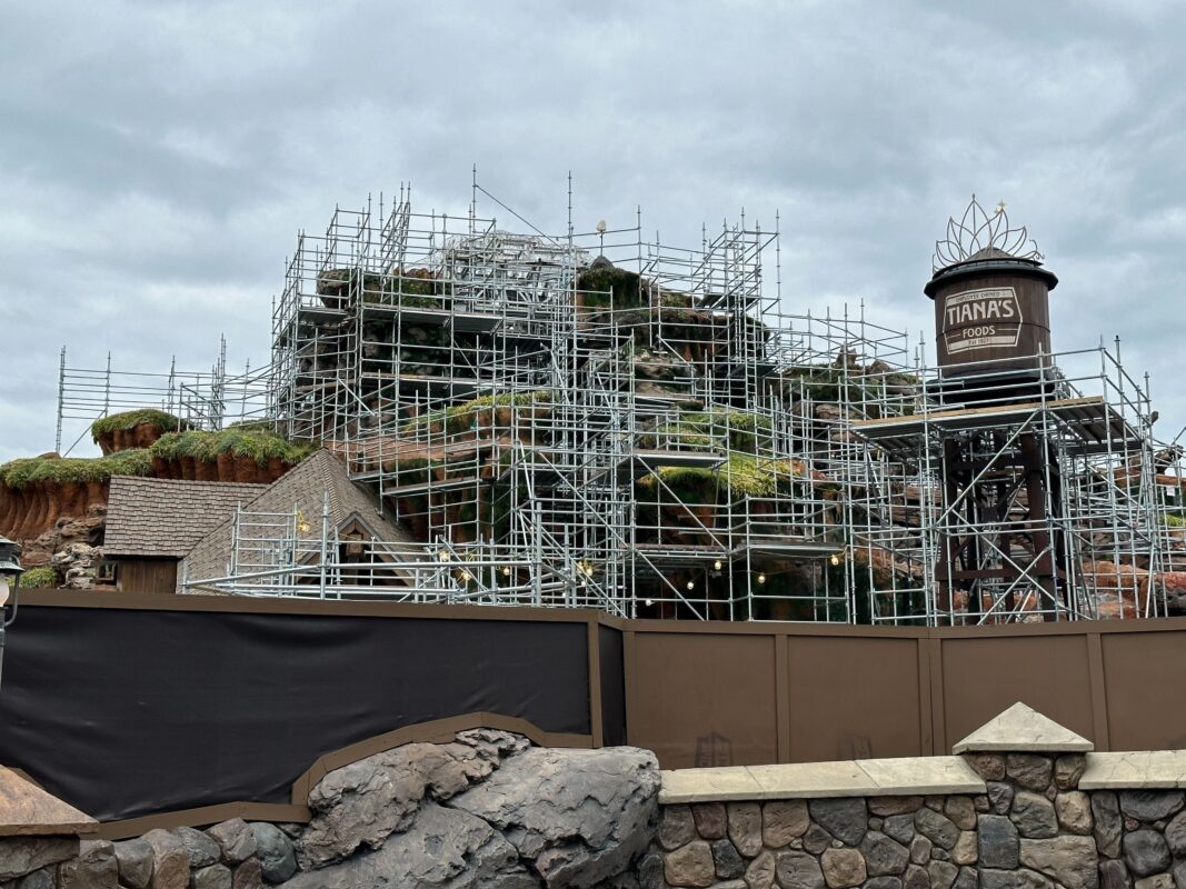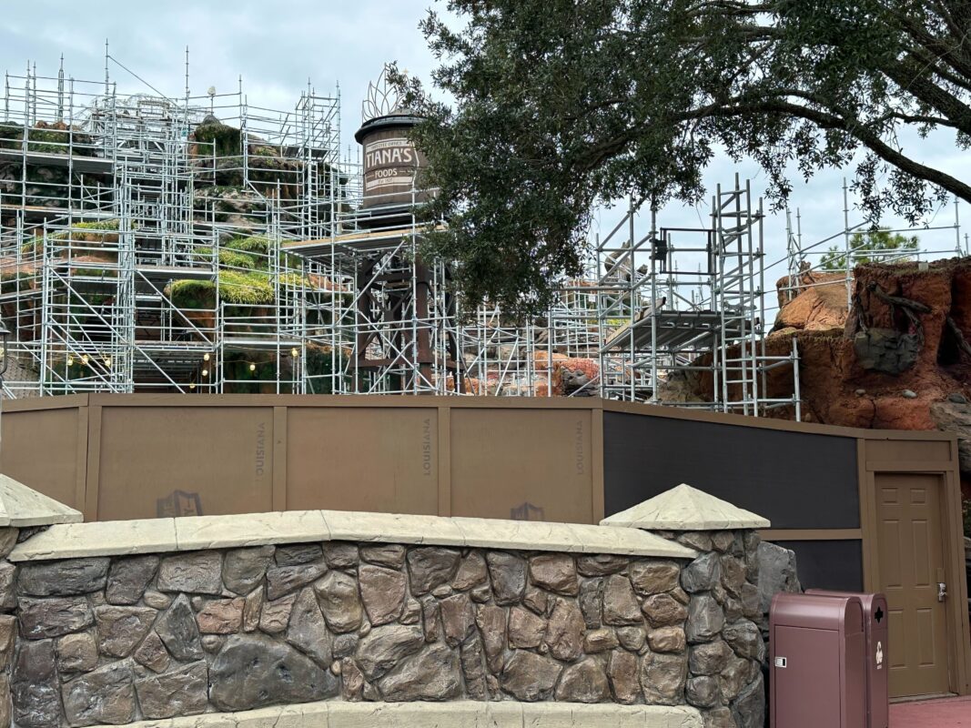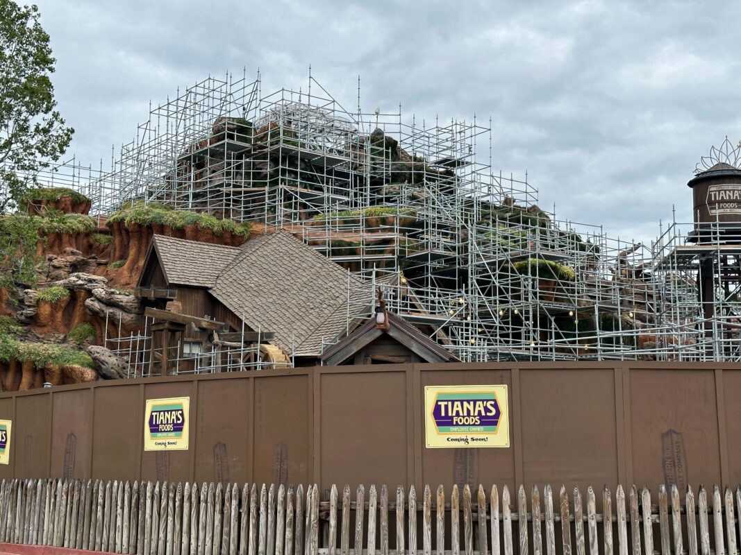 Crews are reconstructing the top of what was once Splash Mountain and will now be Tiana’s Bayou Adventure in Magic Kingdom, plus have added more to the barn mural in the ride’s queue.