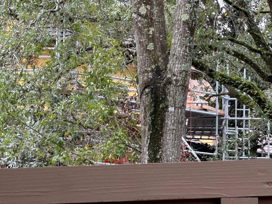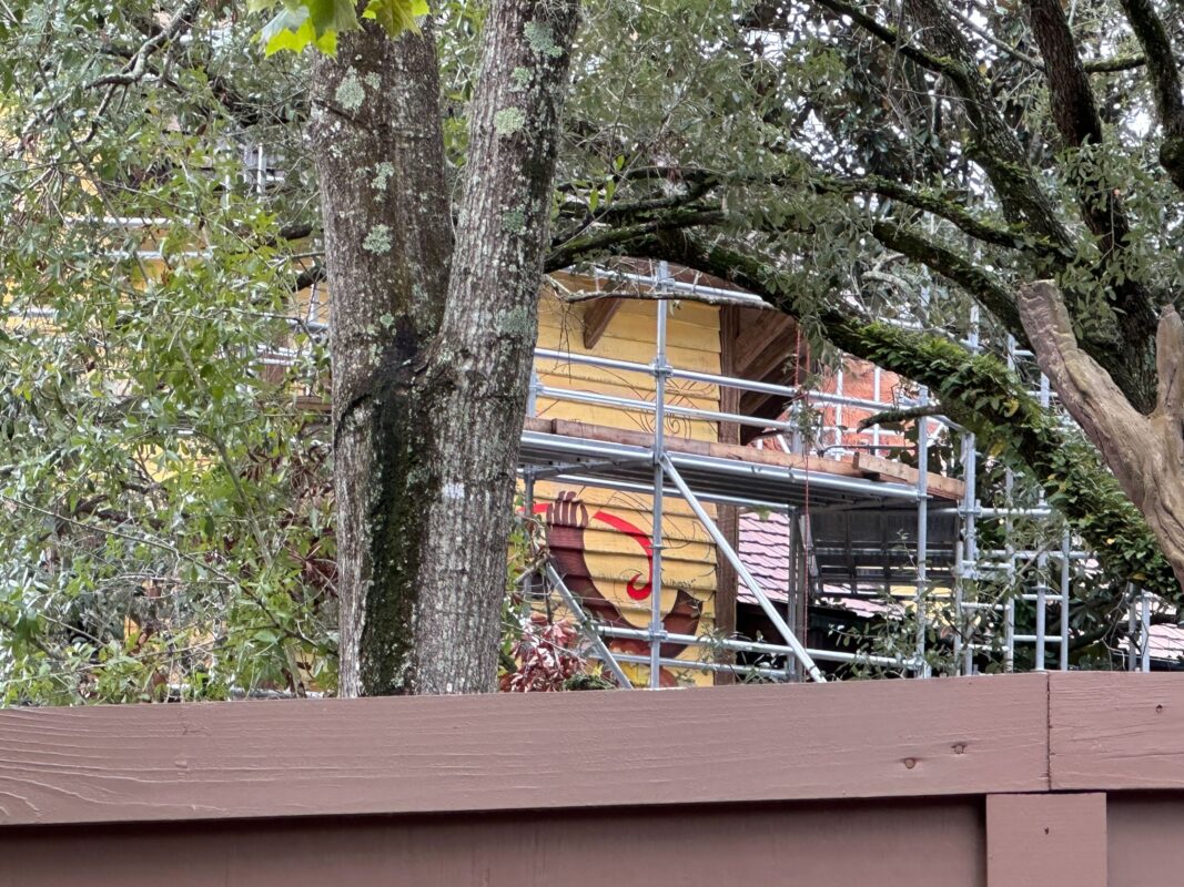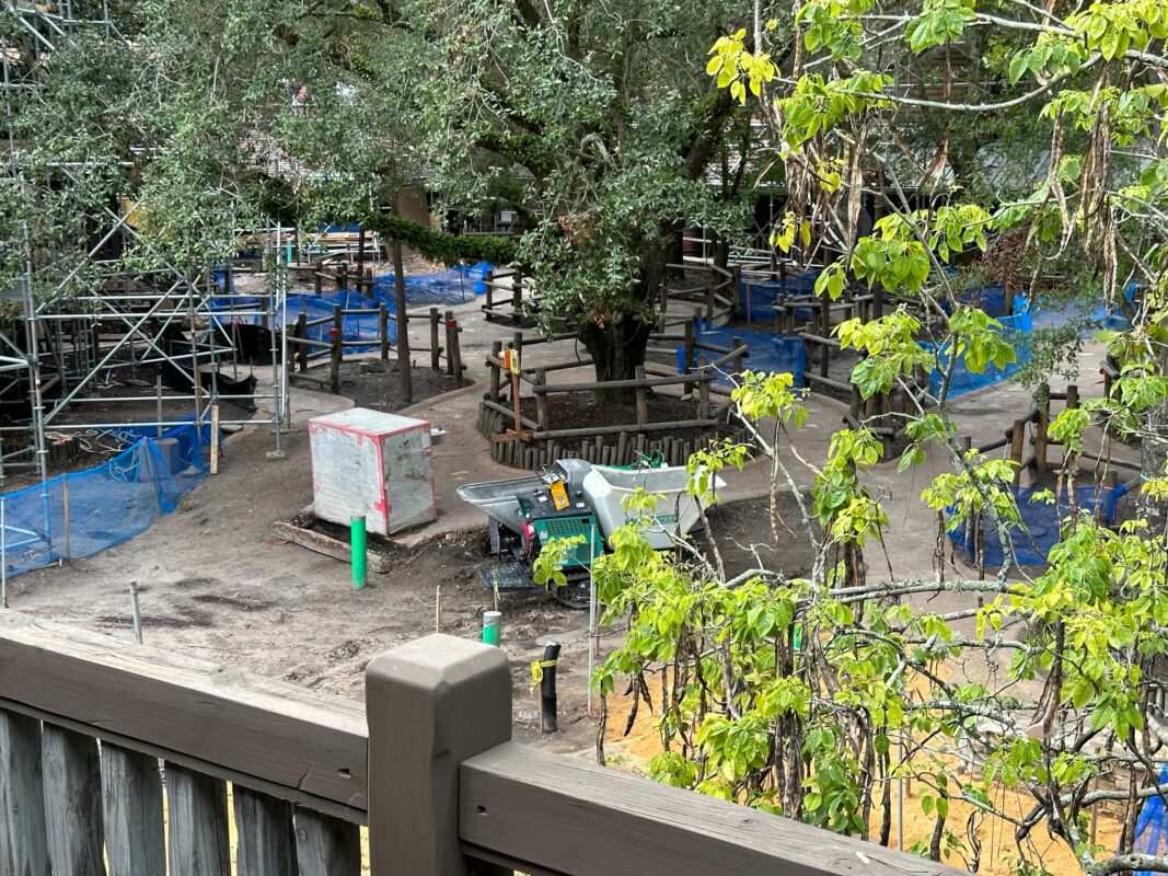 But there is scaffolding along the back of the queue and tarps throughout. Some trees have been removed.