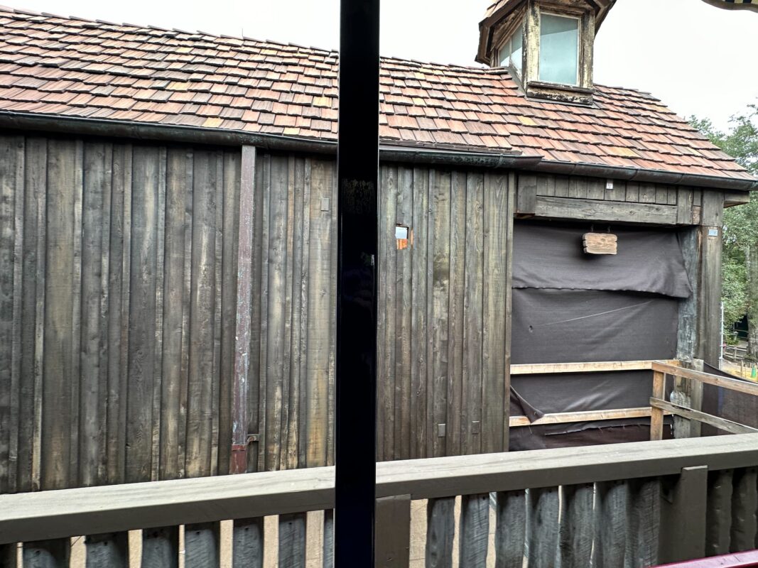 Hopping on one of the Walt Disney World Railroad trains, we took another look at queue construction. A tarp and two wood planks are over this doorway that looks into the queue.