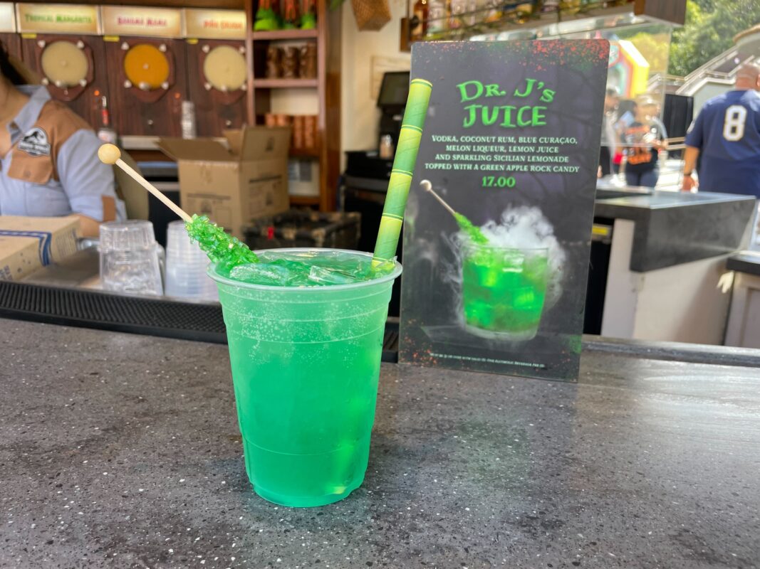 Isla Nu-Bar offers several Jurassic World themed cocktails and tiki cups, but the small sign for Dr. J’s Juice caught our attention. This drink is available from Isla Nu-Bar all day, so even if you’re not hanging out with the monsters late at night, you can still get this specialty cocktail.