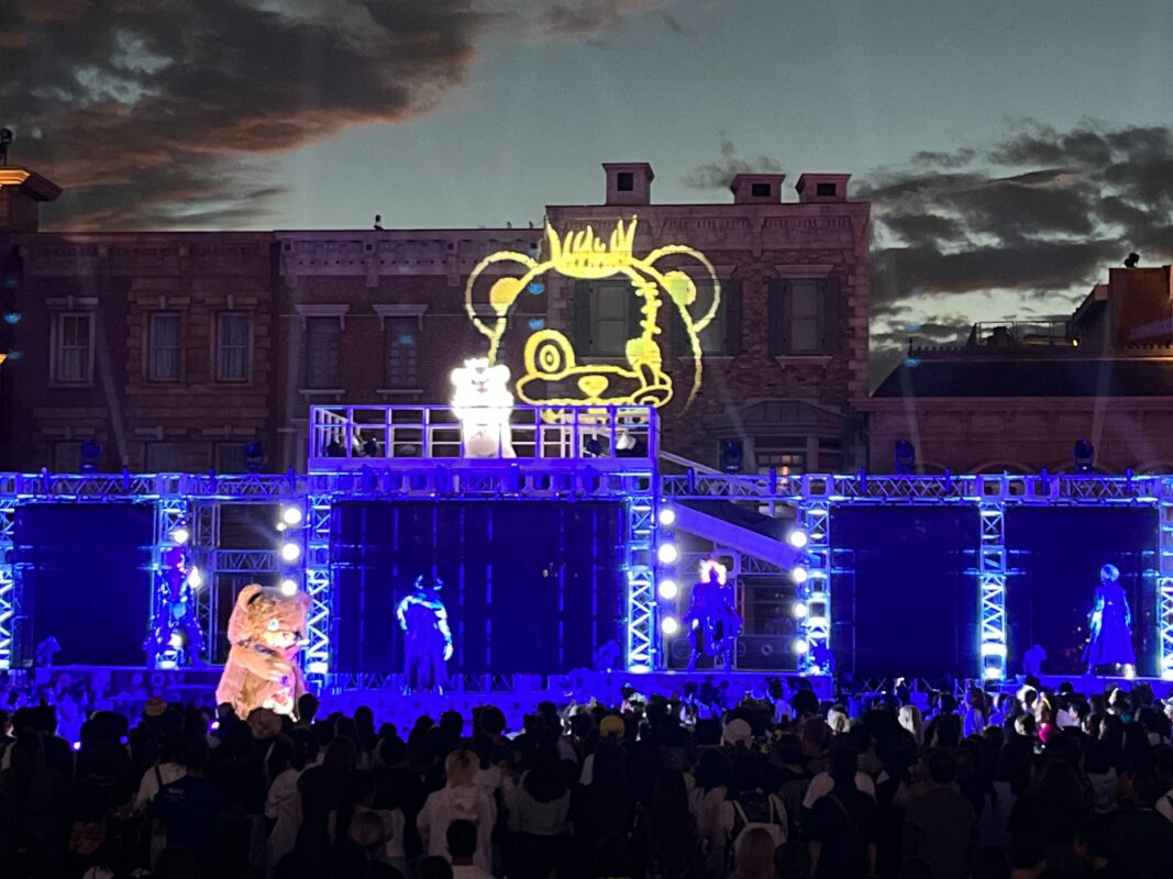 The Halloween Horror Nights Japan icon is quickly joined by Hamikuma Soul, who appears on a platform above the stage.