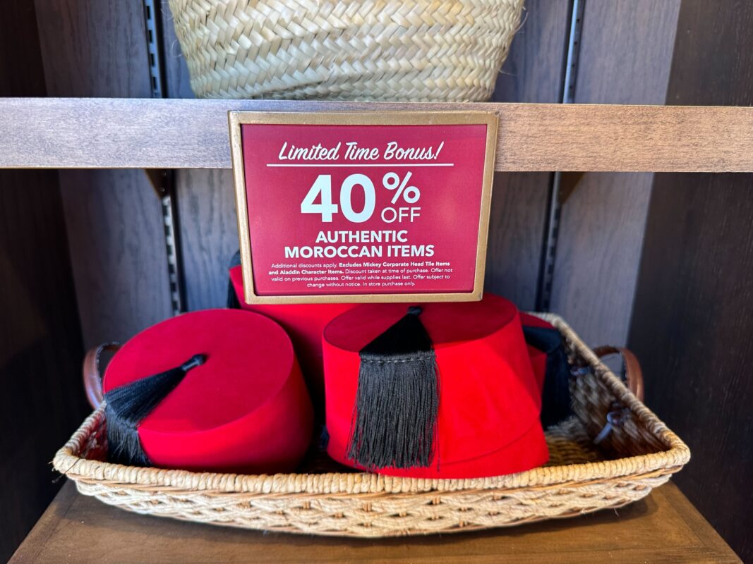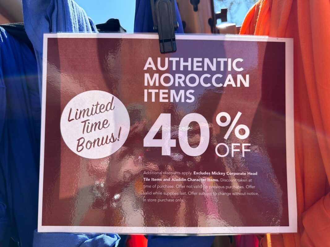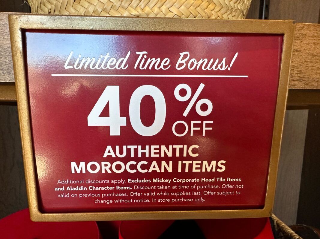 Signs for the sale are up at Souk-al-Magreb, the shop next to Spice Road Table. The sale does not include Mickey and “Aladdin” items also sold at the location. Additional discounts, like an Annual Passholder discount, also apply.