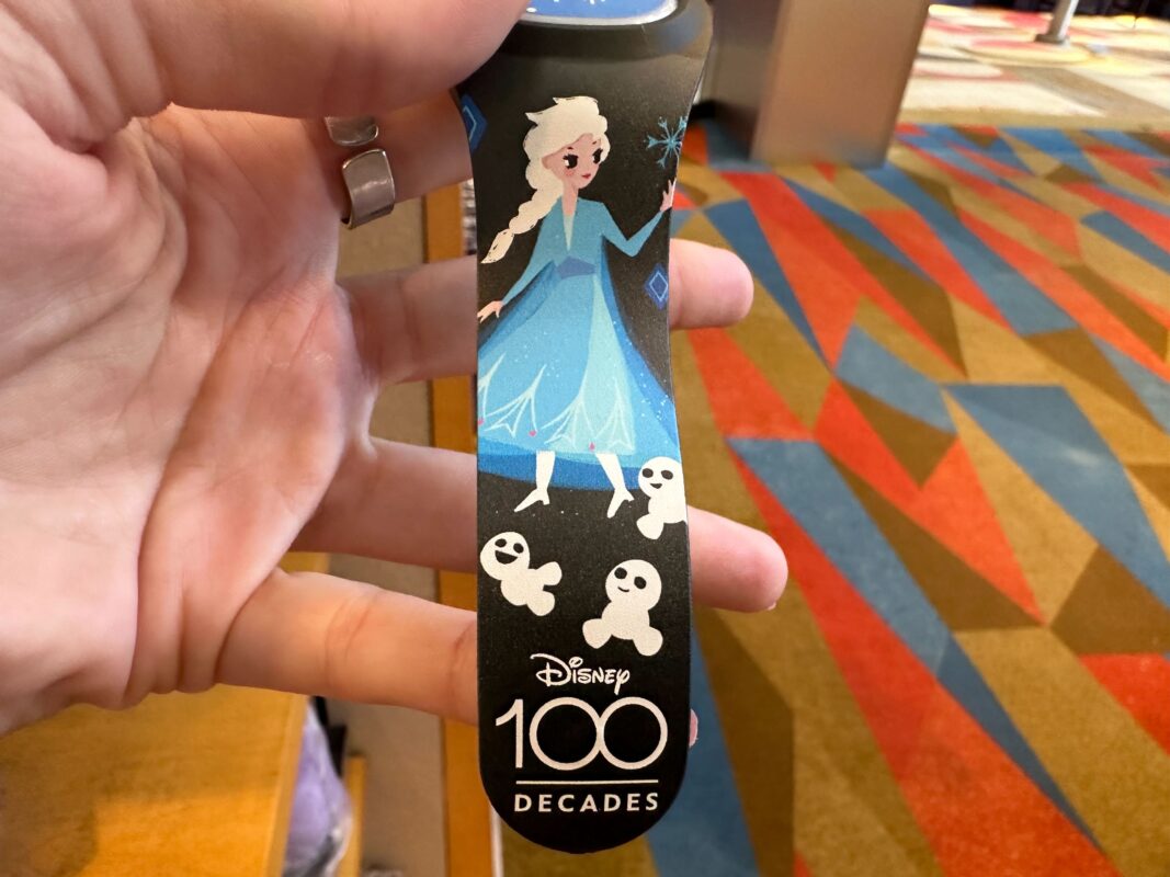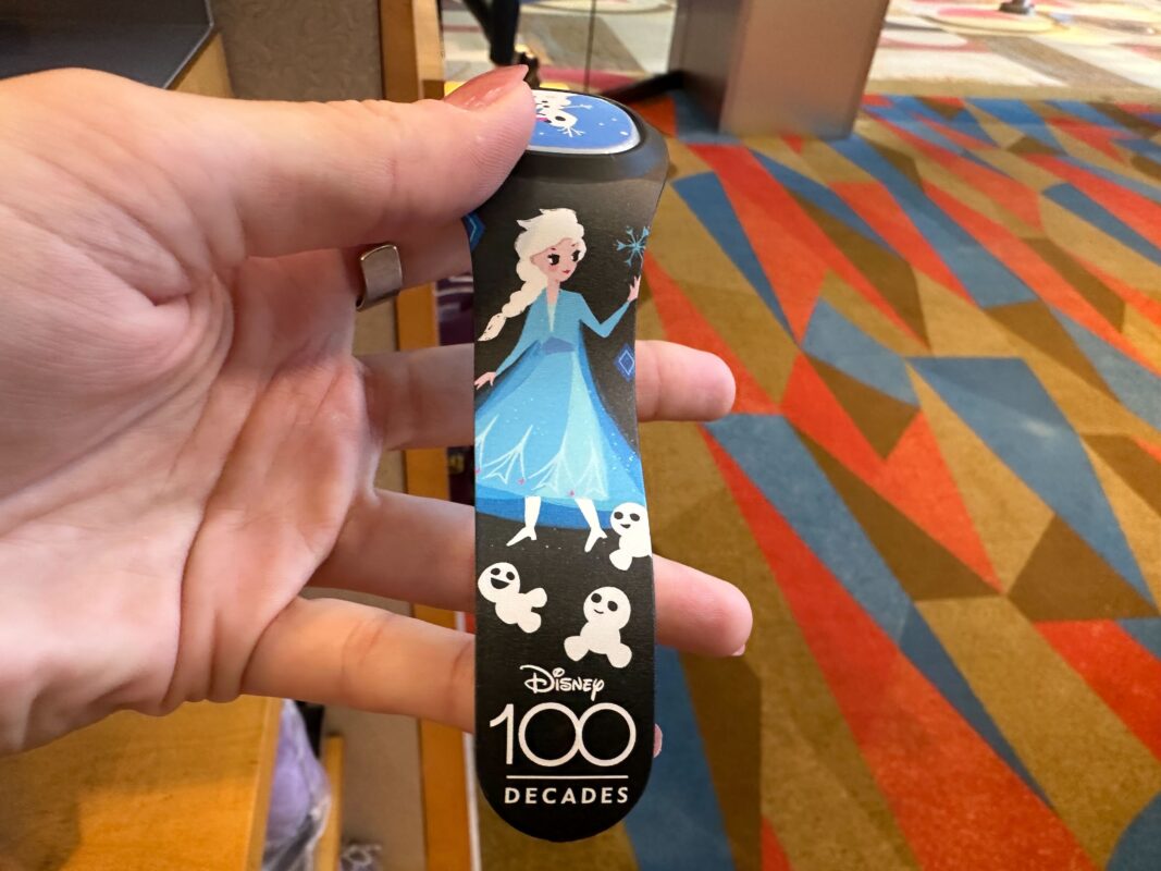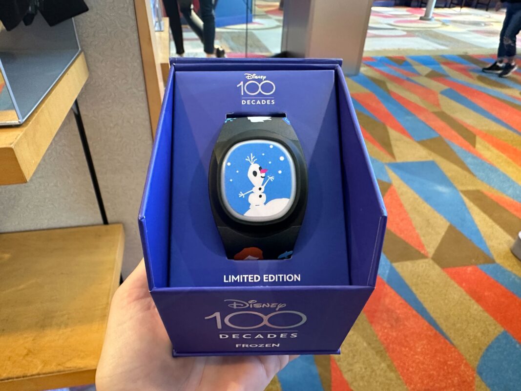 The box says “Frozen” but Anna and Elsa’s outfits are closer to their sequel attire. The “Frozen” MagicBand+ has a black band and blue puck.