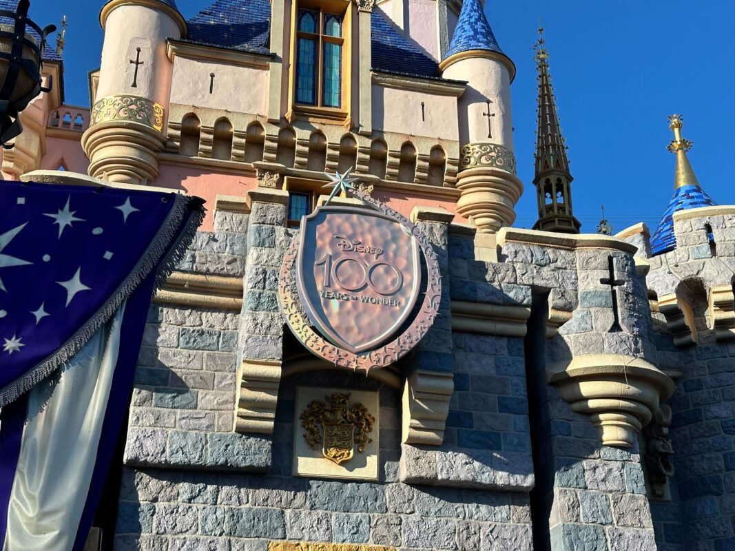 The Disney100 Years of Wonder shield still hangs above the drawbridge, but the statues of the Flora, Fauna, and Merryweather, as well as the decorative bunting that hung underneath the shield that was held up by the fairies.