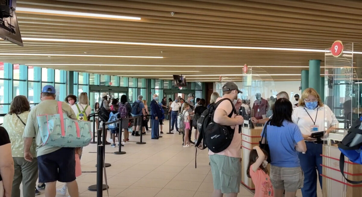Once you’re inside the terminal, you will go through a quick check-in process with a Cast Member, showing them your passport or other identification.