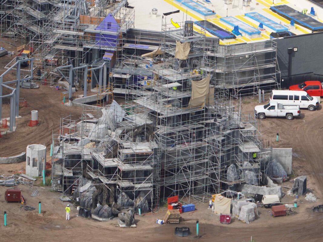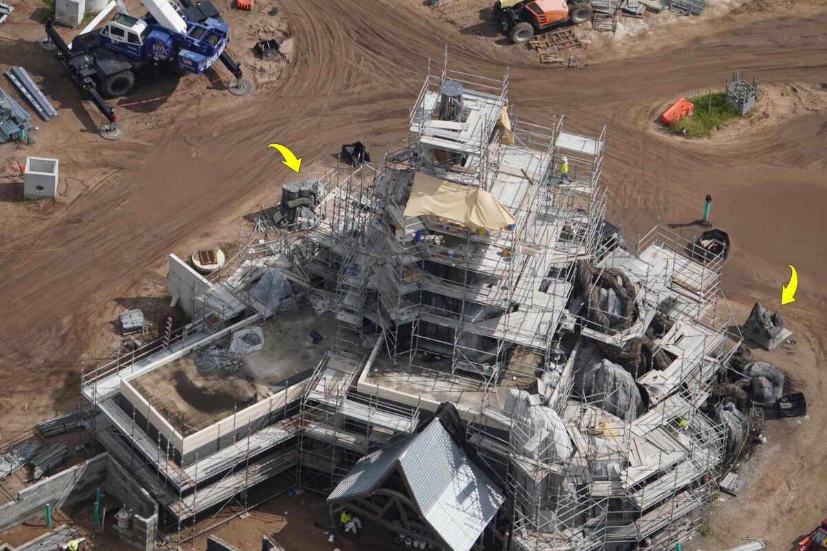 The land’s “portal” entrance will take guests through a giant tree with gnarled roots over rocks. At the bottom of this photo is a peaked roof. The yellow arrows point at models for painting the rocks. Brown tree roots are visible descending over rocks behind scaffolding on the right.