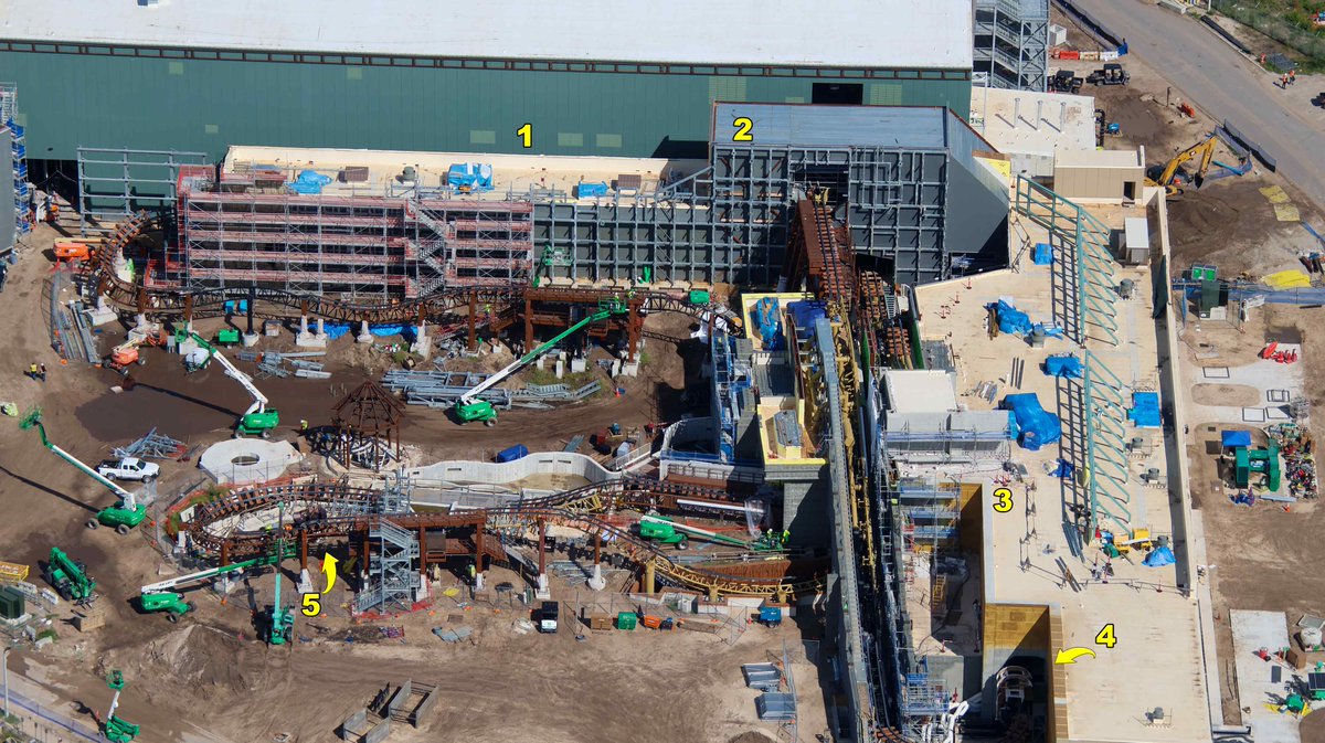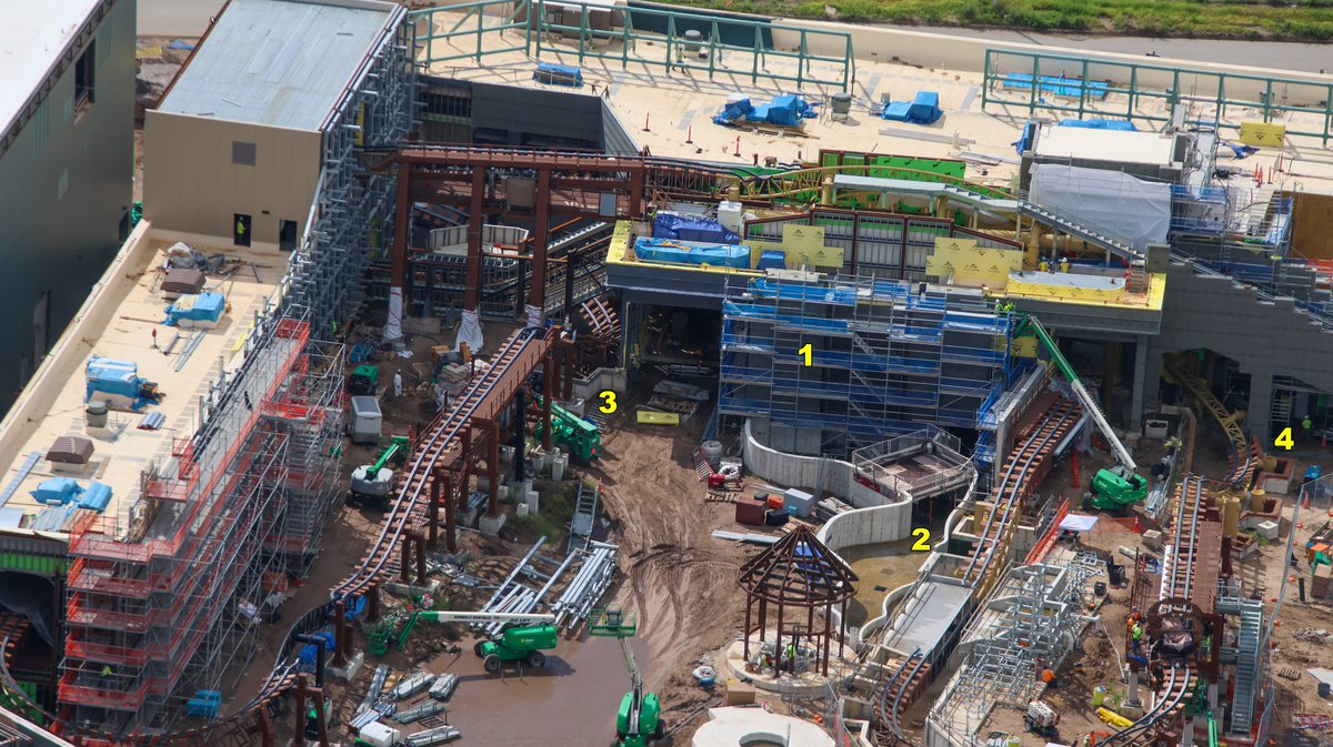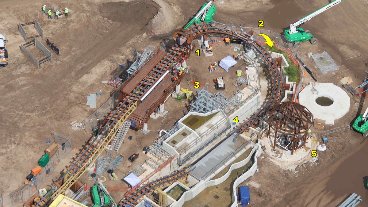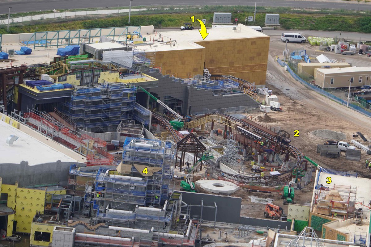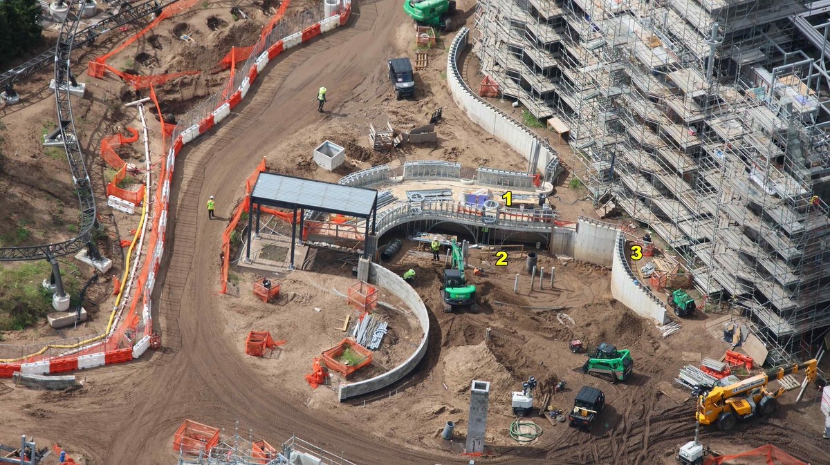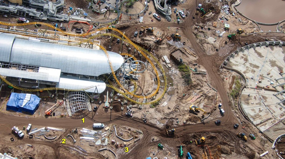 The coaster tracks do curve around the front of the building, too. At 1 in this photo is the steel framework of the attraction’s future entrance. 2 and 3 mark a few short rounded walls.