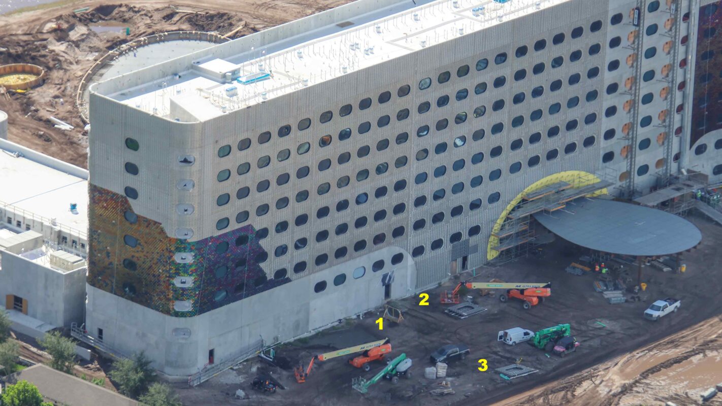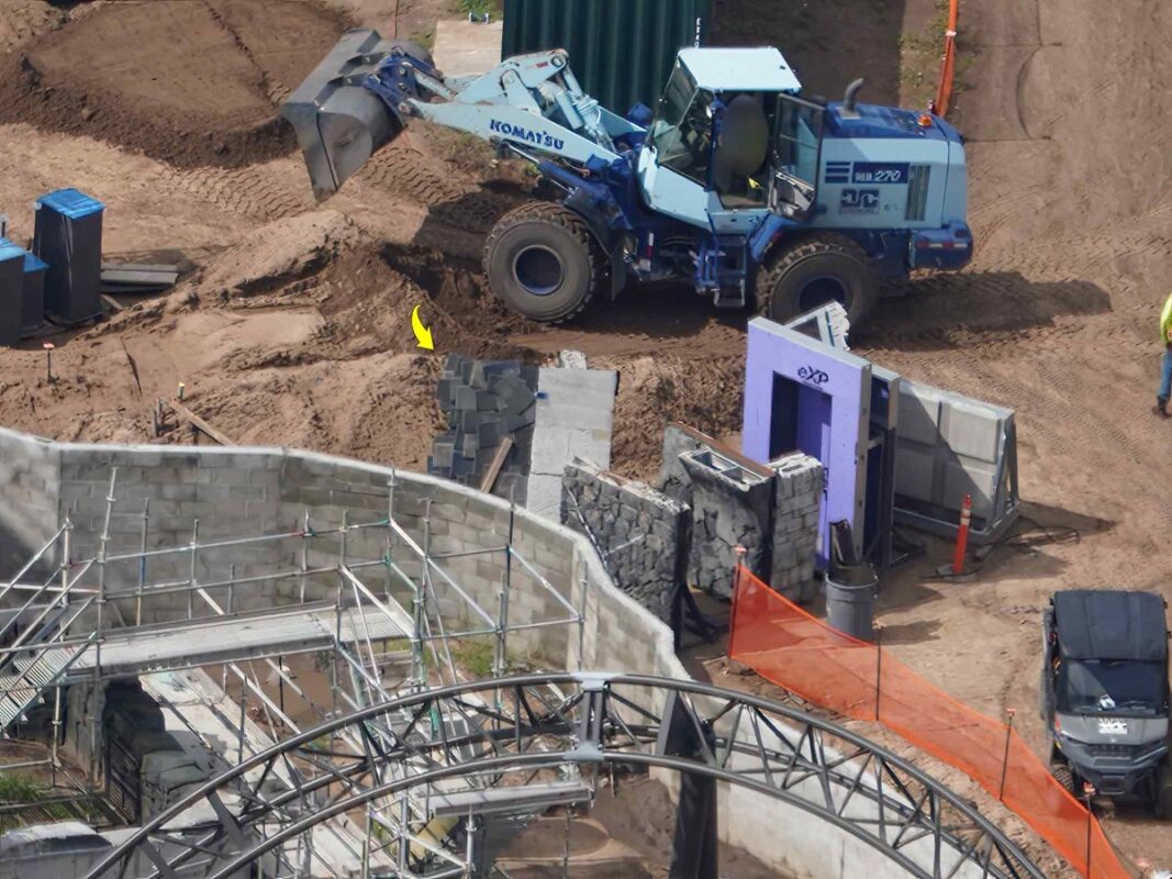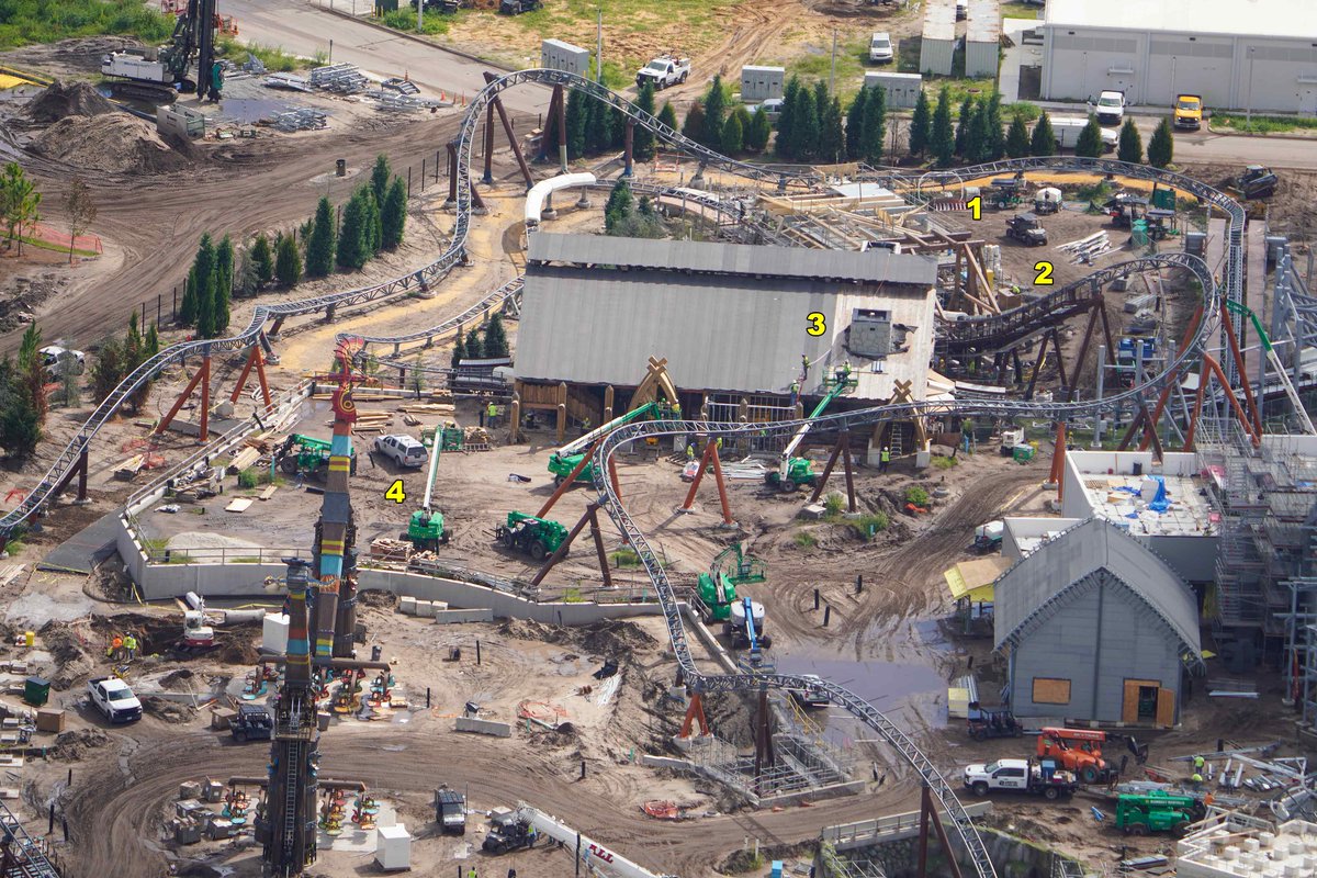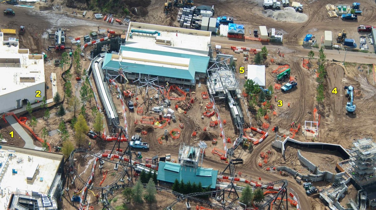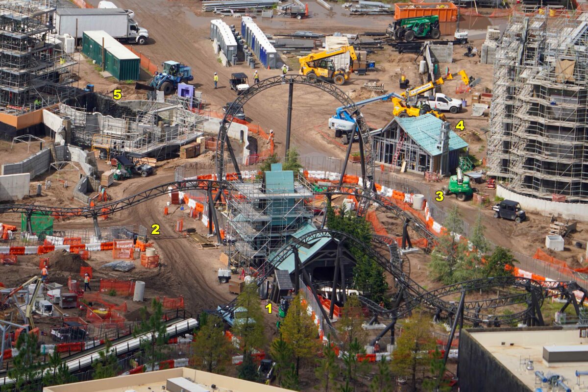 The coaster tracks do curve around the front of the building, too. At 1 in this photo is the steel framework of the attraction’s future entrance. 2 and 3 mark a few short rounded walls.
