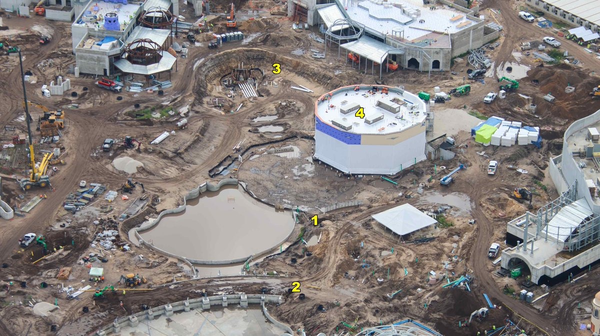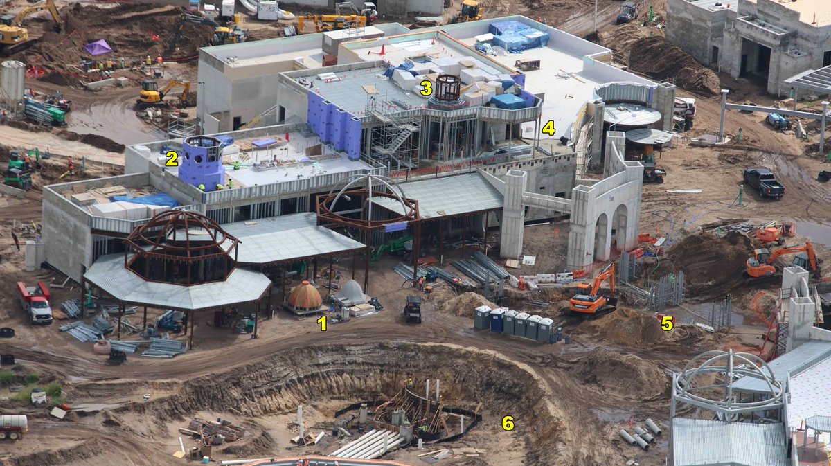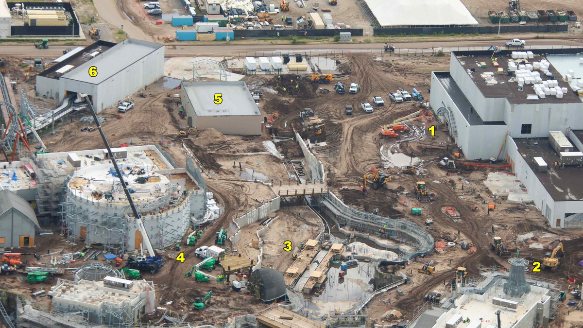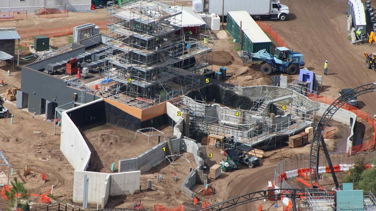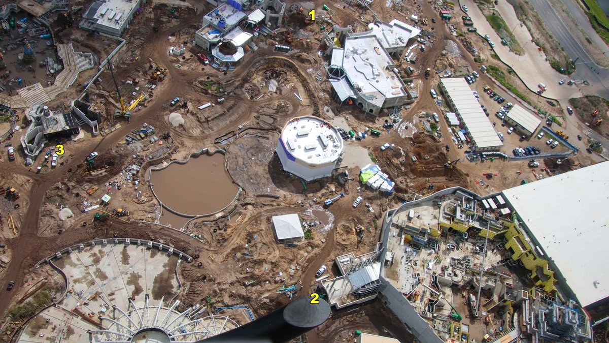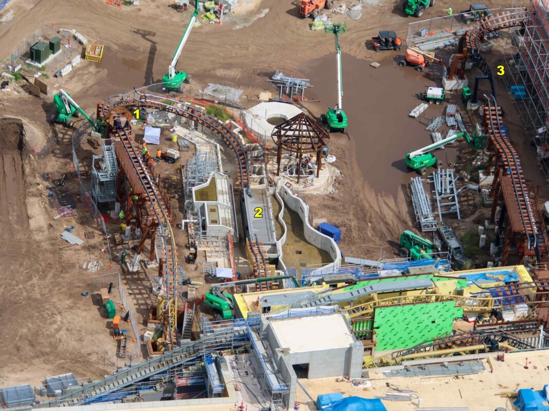 The coaster tracks do curve around the front of the building, too. At 1 in this photo is the steel framework of the attraction’s future entrance. 2 and 3 mark a few short rounded walls.