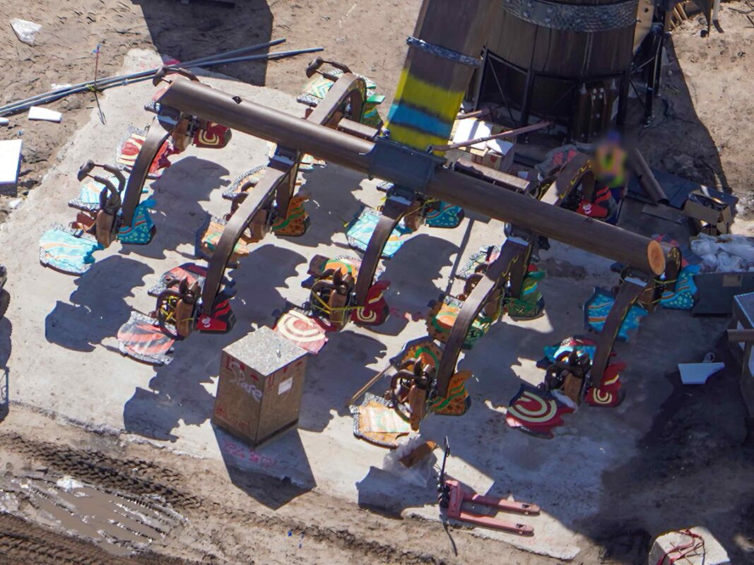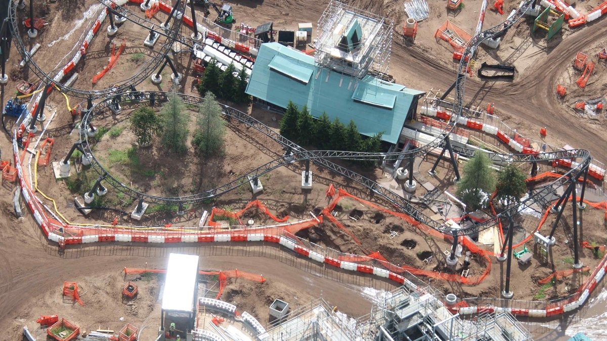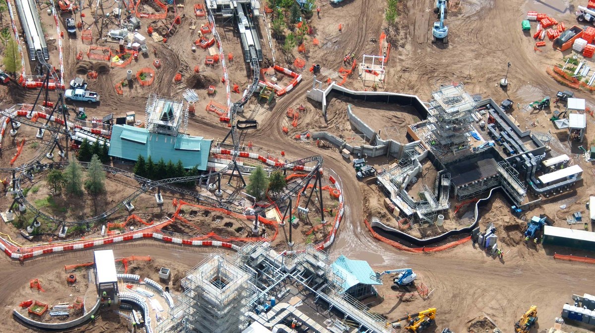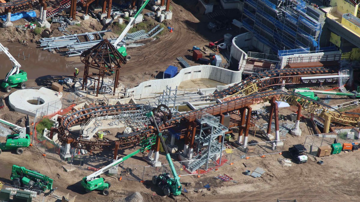 These overviews show that some greenery has begun to be planted at the park, mainly around the yellow and orange tracks of the dual-racing coaster.