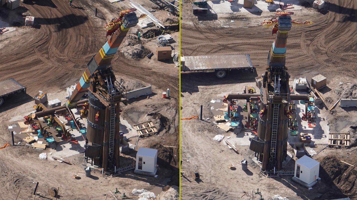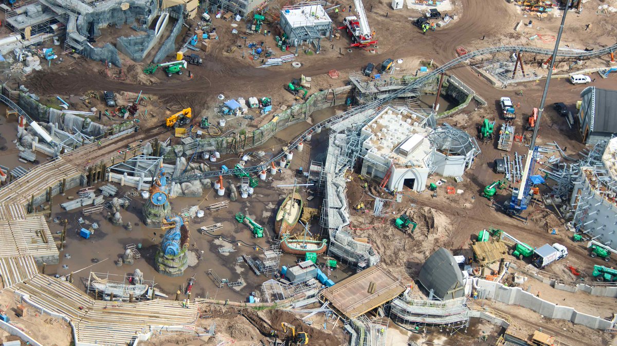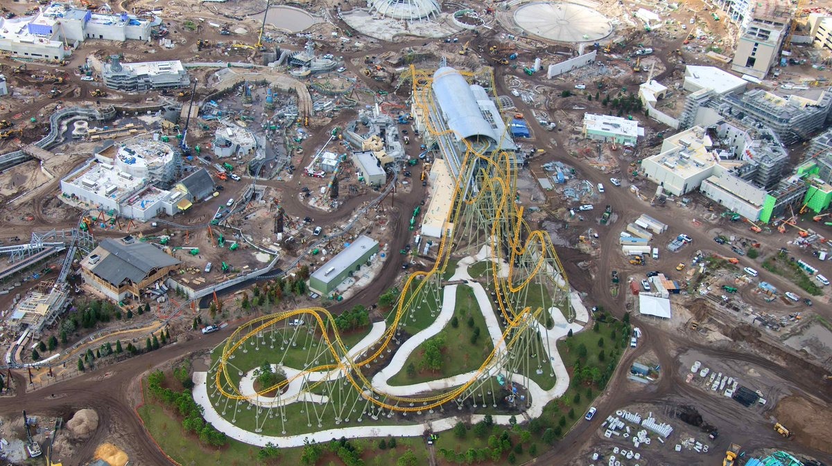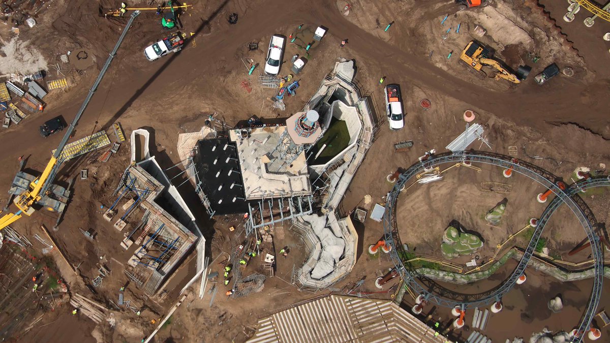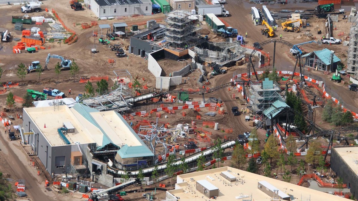 These overviews show that some greenery has begun to be planted at the park, mainly around the yellow and orange tracks of the dual-racing coaster.