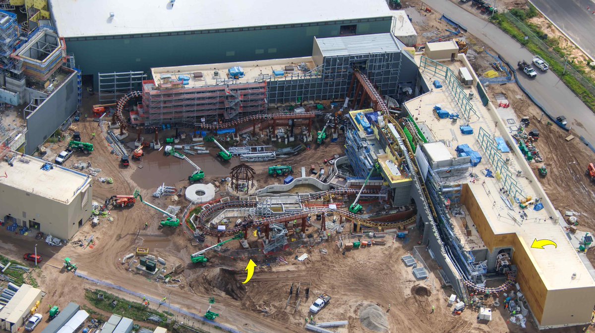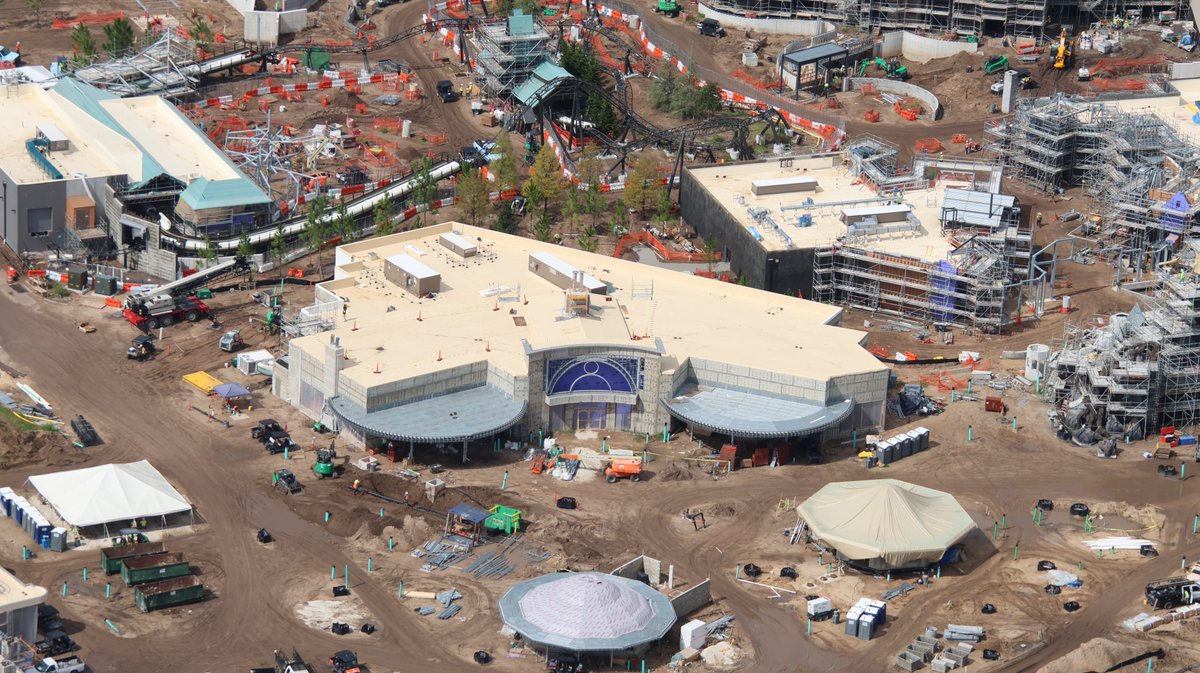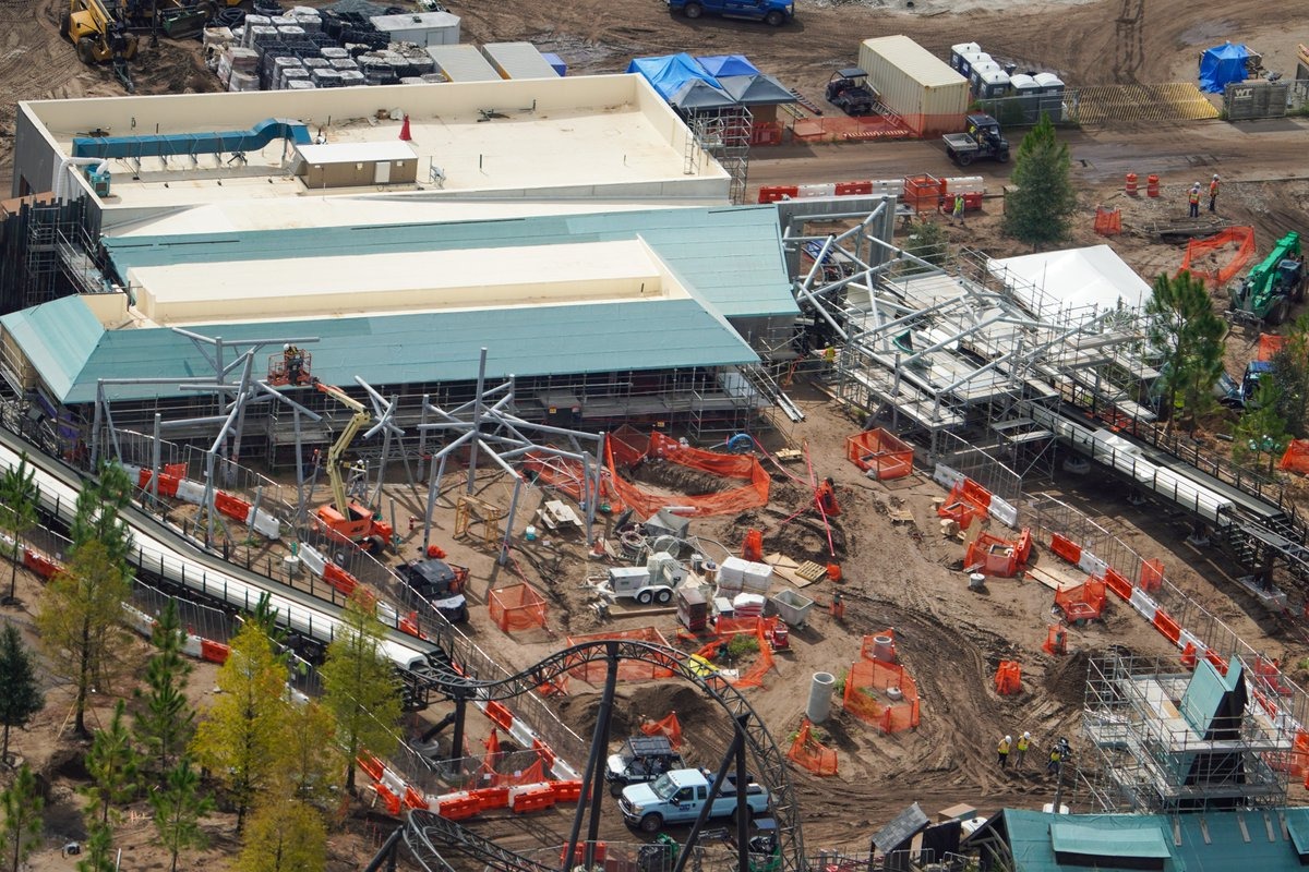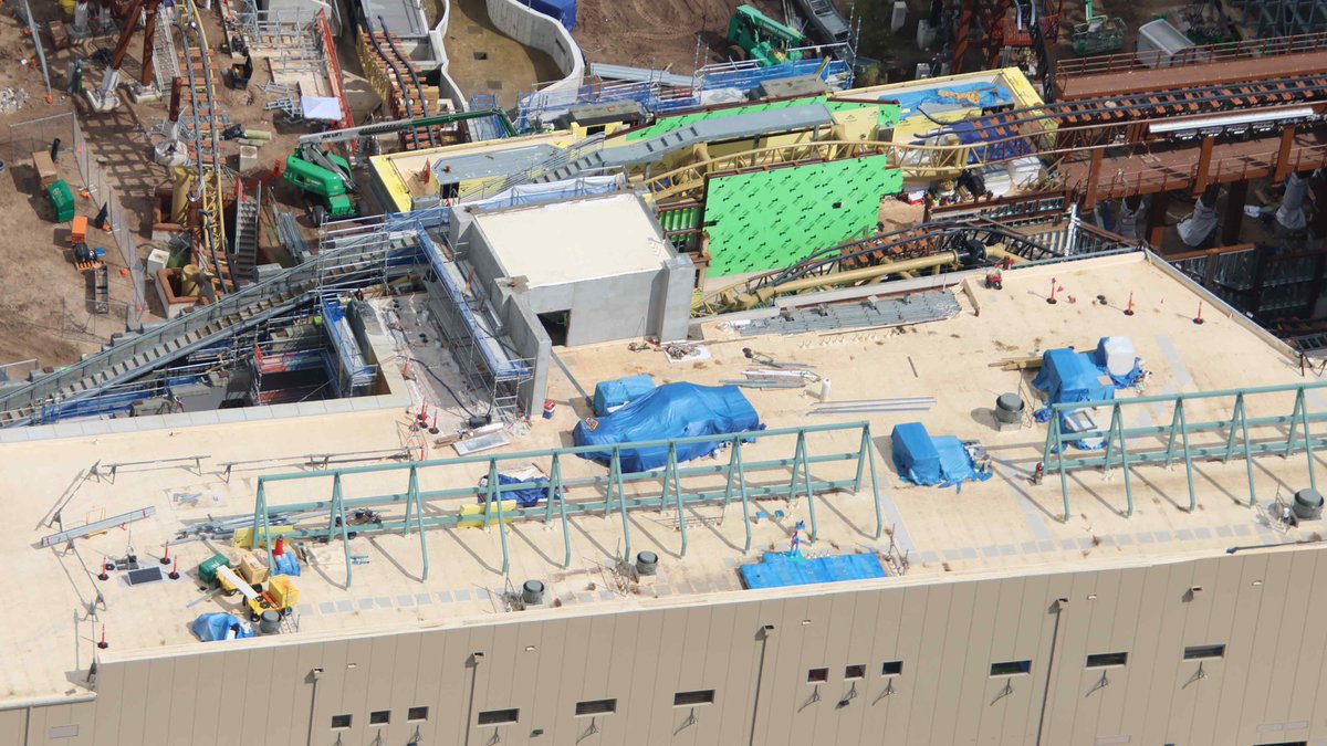Some construction materials are staged on top of the show building for the coaster and covered in blue tarps.
