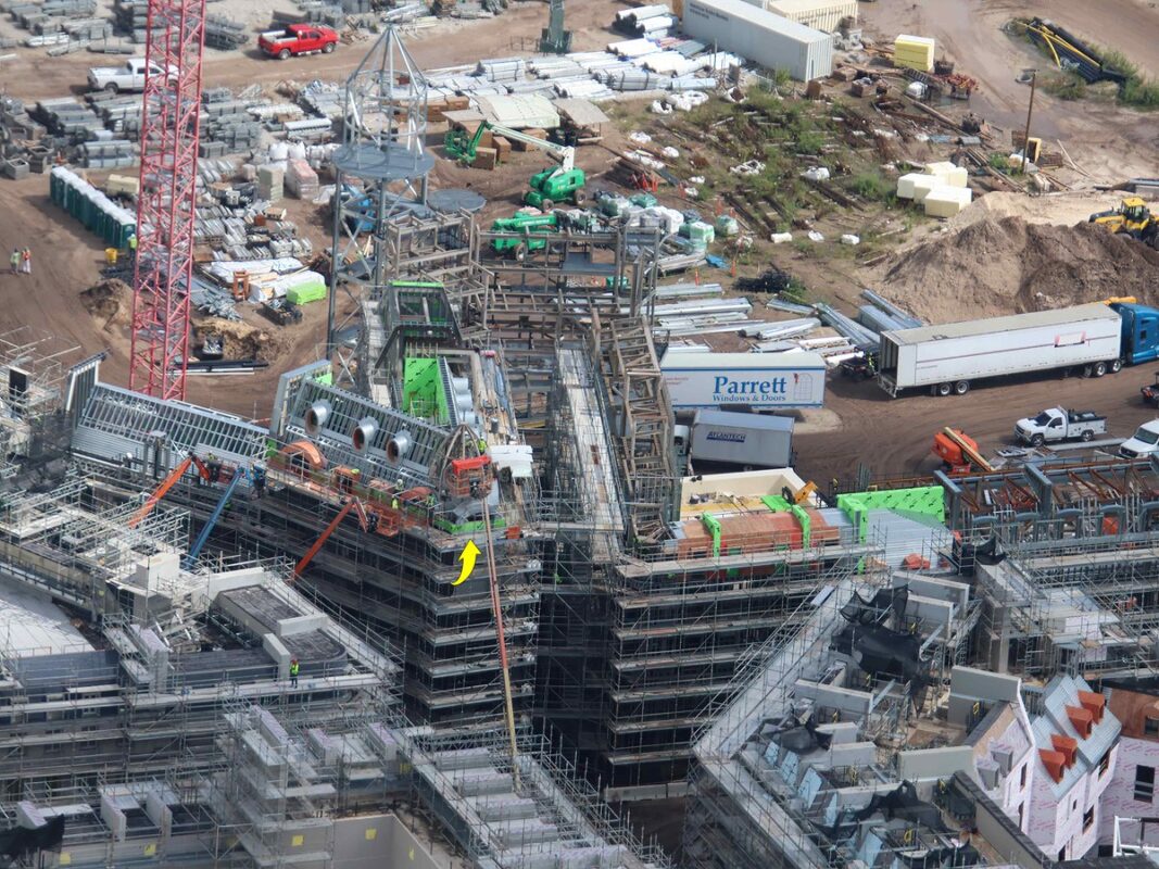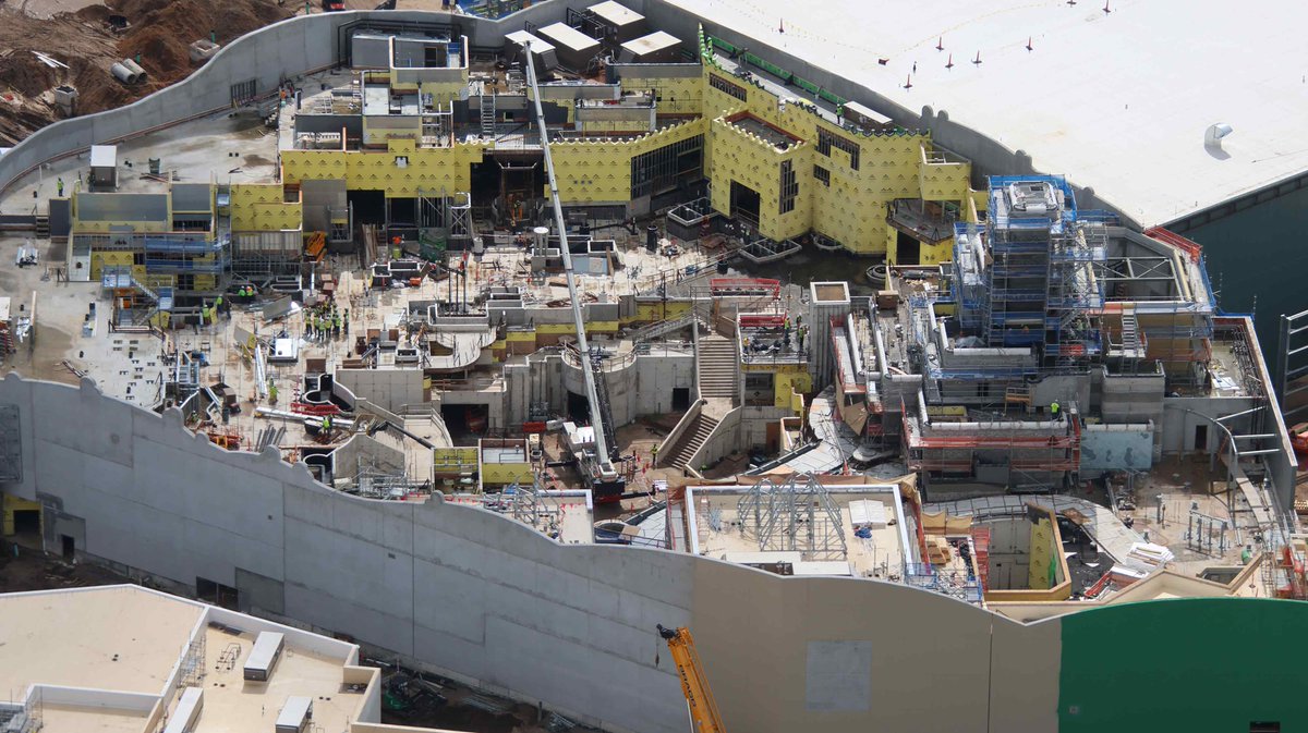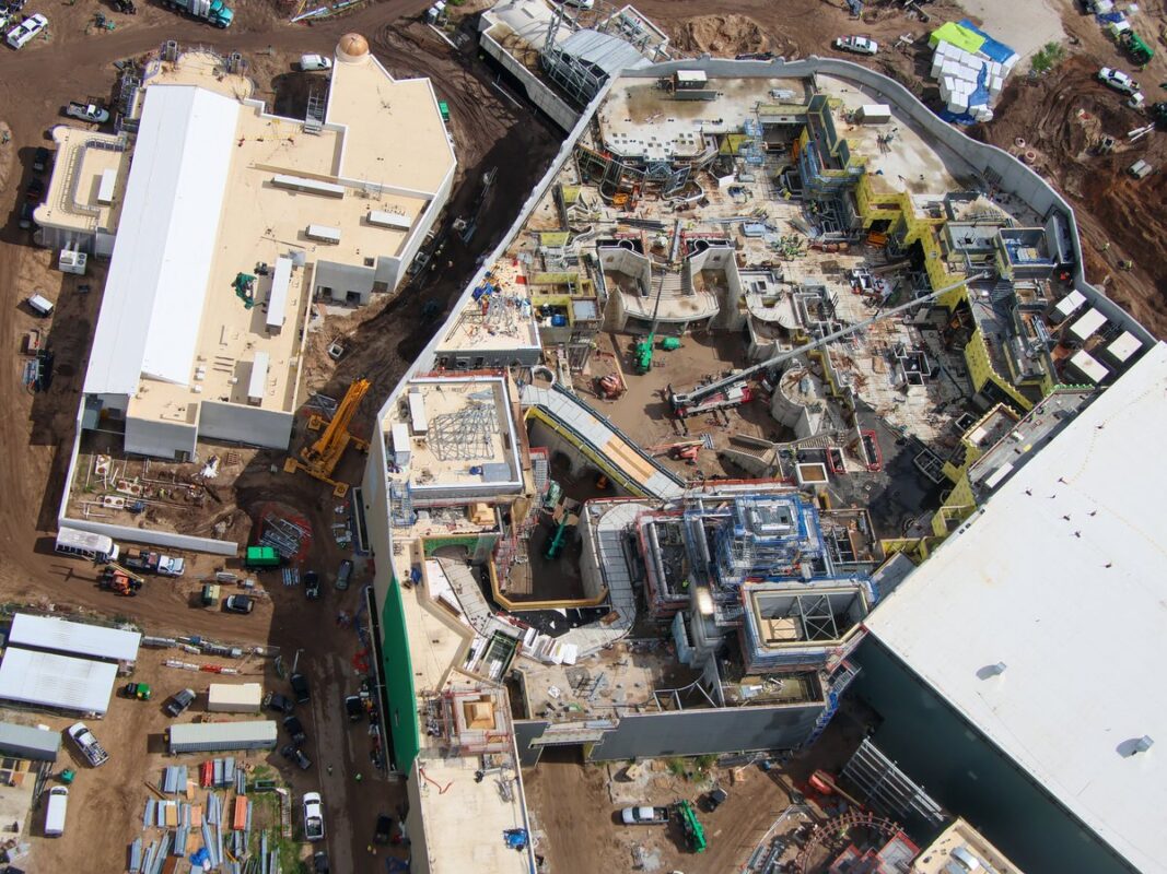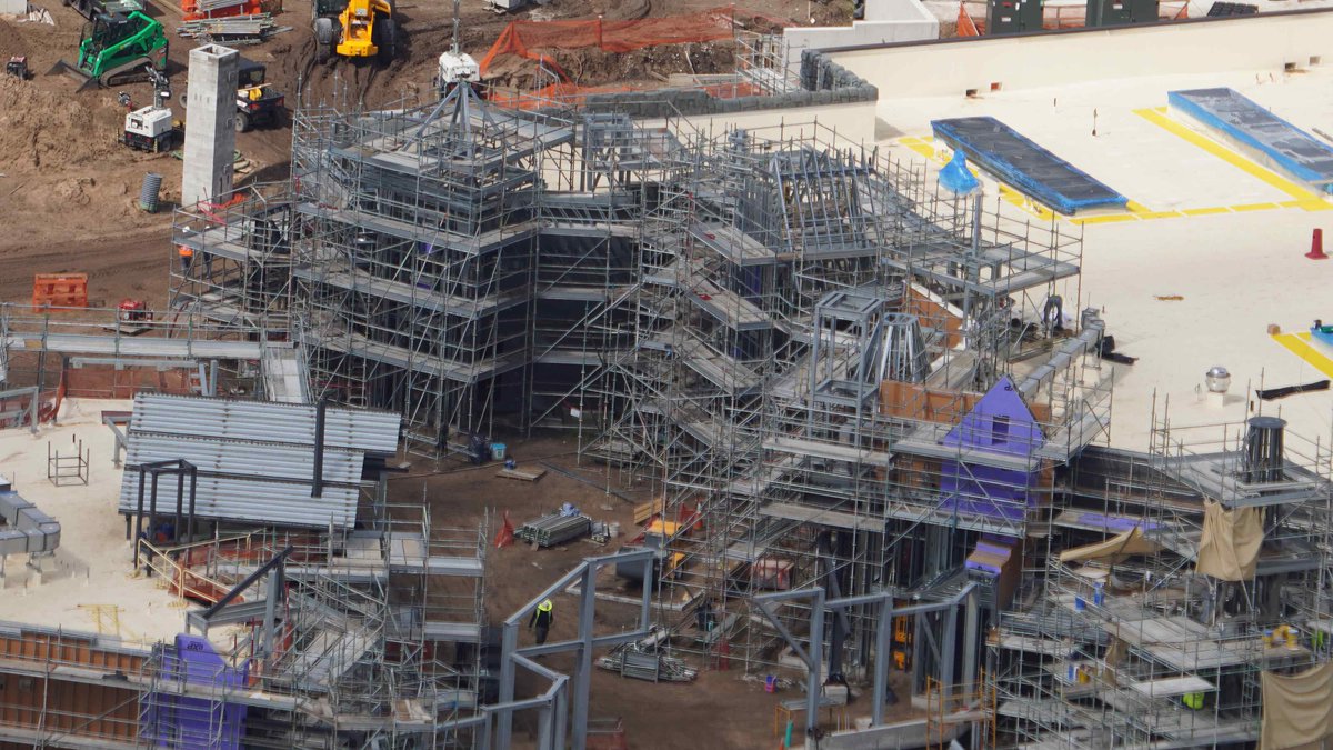 This photo shows the coaster’s entrance building. There are large steel frames in this photo, thought to be for themed tents.
