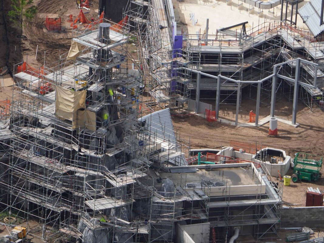 This series of structures is for the roller-coaster and a second smaller attraction. The large light gray rocks are at the coaster’s second launch. The service building to the right contains electrical equipment for the launch.