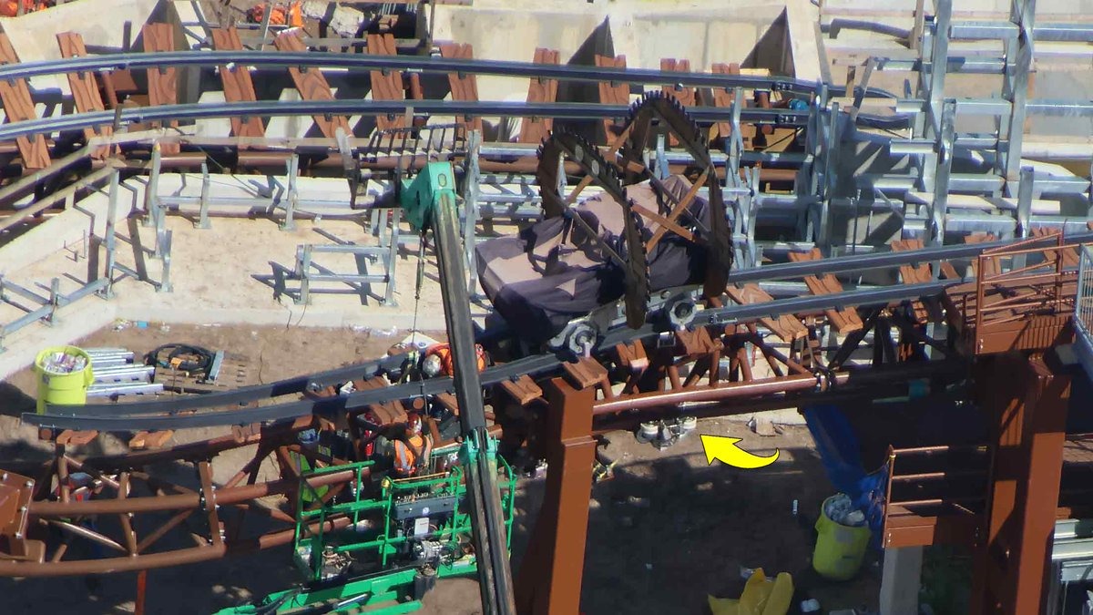 Super Nintendo World will be similar to its counterparts at Universal Studios Japan and Universal Studios Hollywood, but will open with a Donkey Kong area, too. This expansion is also planned for the land in Japan. This photo shows the Donkey Kong roller-coaster, with arrows pointing at test cars with clearance envelopes to ensure guests can’t touch or collide with anything while on the ride.